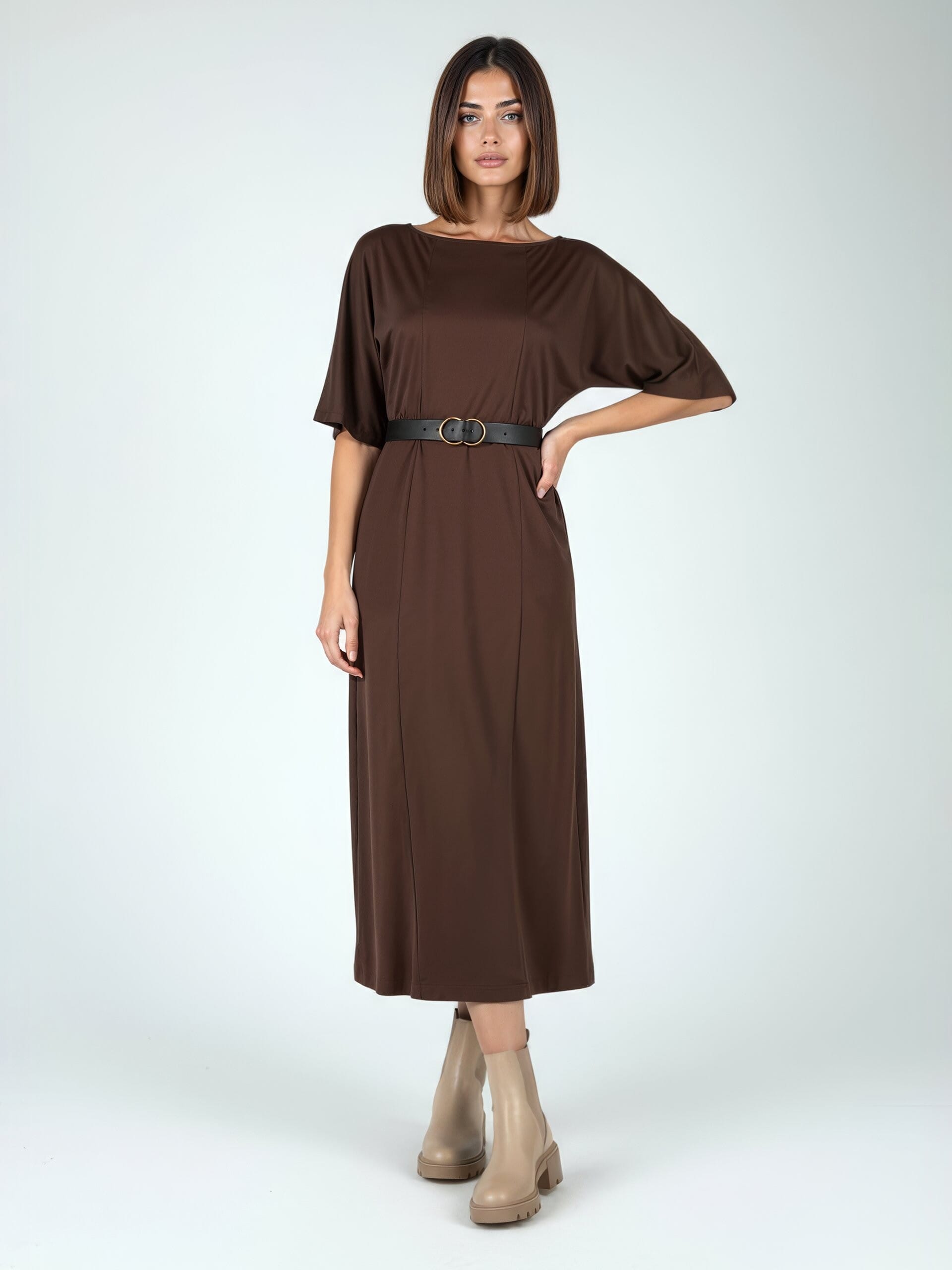 Abito midi Rinascimento, linea svasata con vita definita: il fit morbido scivola e valorizza la silhouette. Jersey di viscosa fluido, piacevole sulla pelle. Cintura in similpelle con fibbia ovale e maniche ampie al gomito per libertà di movimento. Perfetto dall’ufficio all’aperitivo con un cambio di accessori.