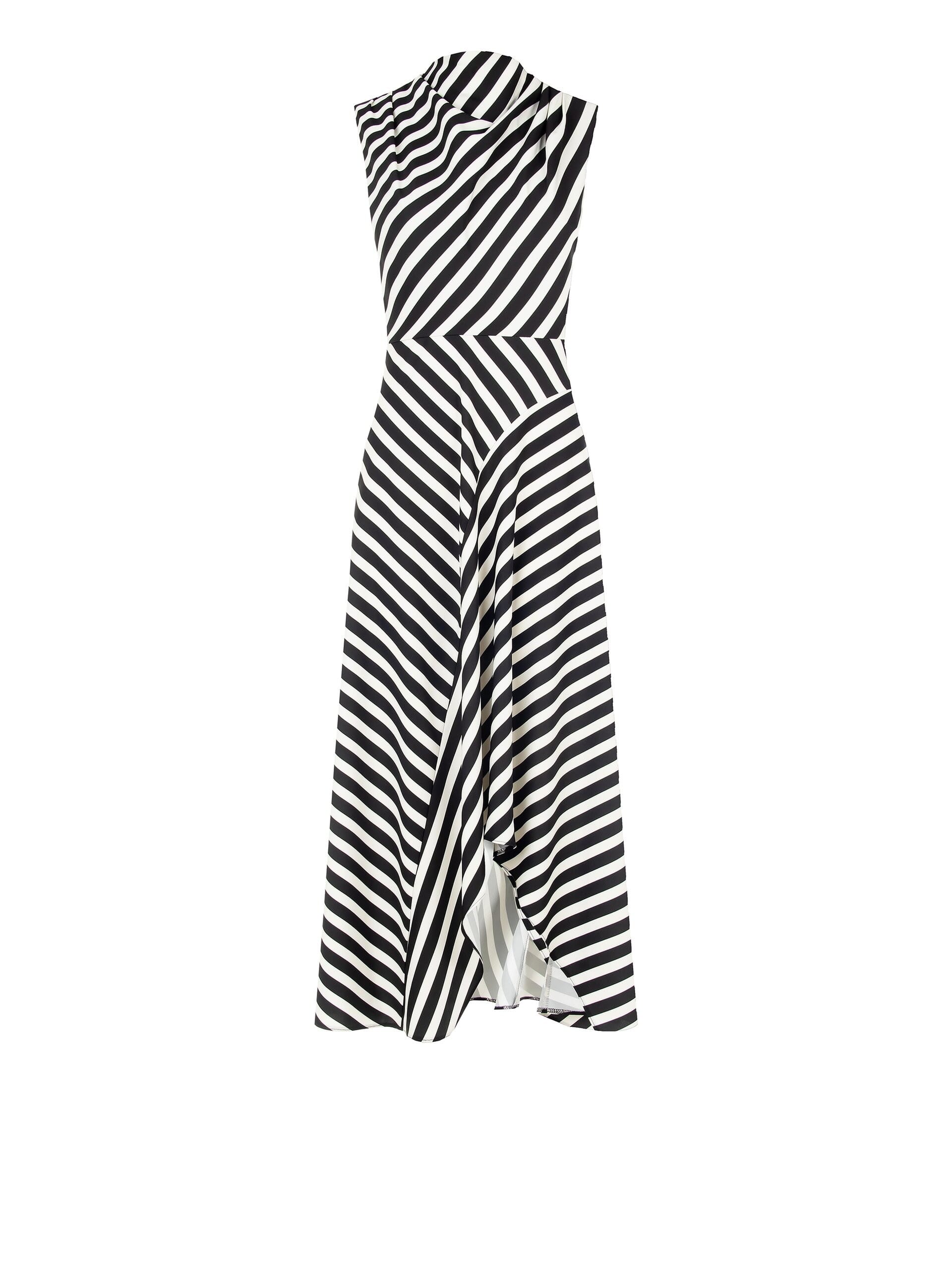 Abito Lungo Asimmetrico Accollato in Tessuto Fluido a Righe