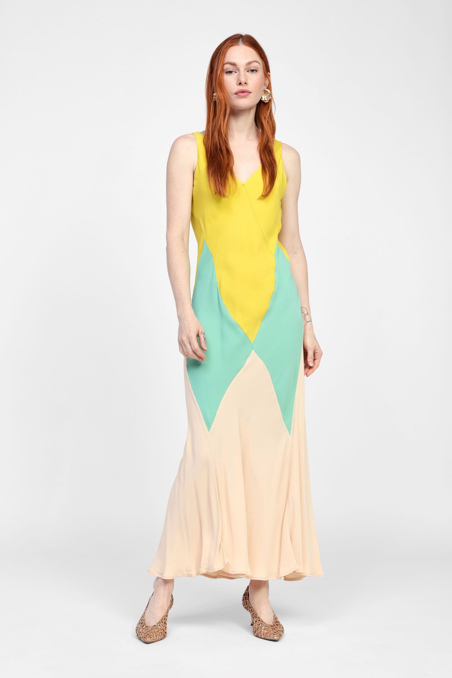 Il fascino di questo abito lungo si manifesta attraverso un gioco di blocchi di colore che si fondono armoniosamente. Il design con spalline e lo scollo a v esalta la figura, rendendolo perfetto per le giornate estive in città o per una passeggiata serale. Questo capo unisce praticità e stile, permettendoti di esprimere la tua personalità con eleganza discreta.