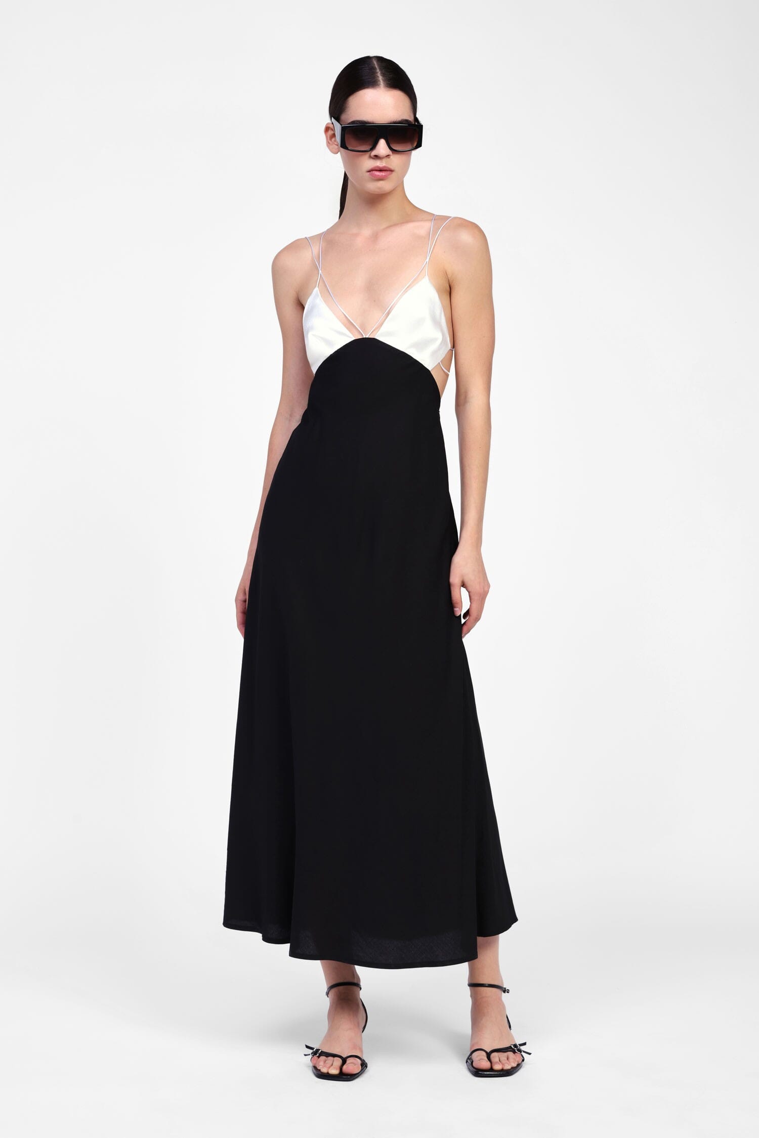 Intrigante e versatile, questo abito lungo presenta spalline sottili che incorniciano delicatamente le spalle, mentre lo scollo a v aggiunge un tocco di charme. Il design a blocchi di colore crea un contrasto sofisticato, perfetto per adattarsi a qualsiasi occasione quotidiana. Un capo che unisce comfort e stile con disinvoltura.
