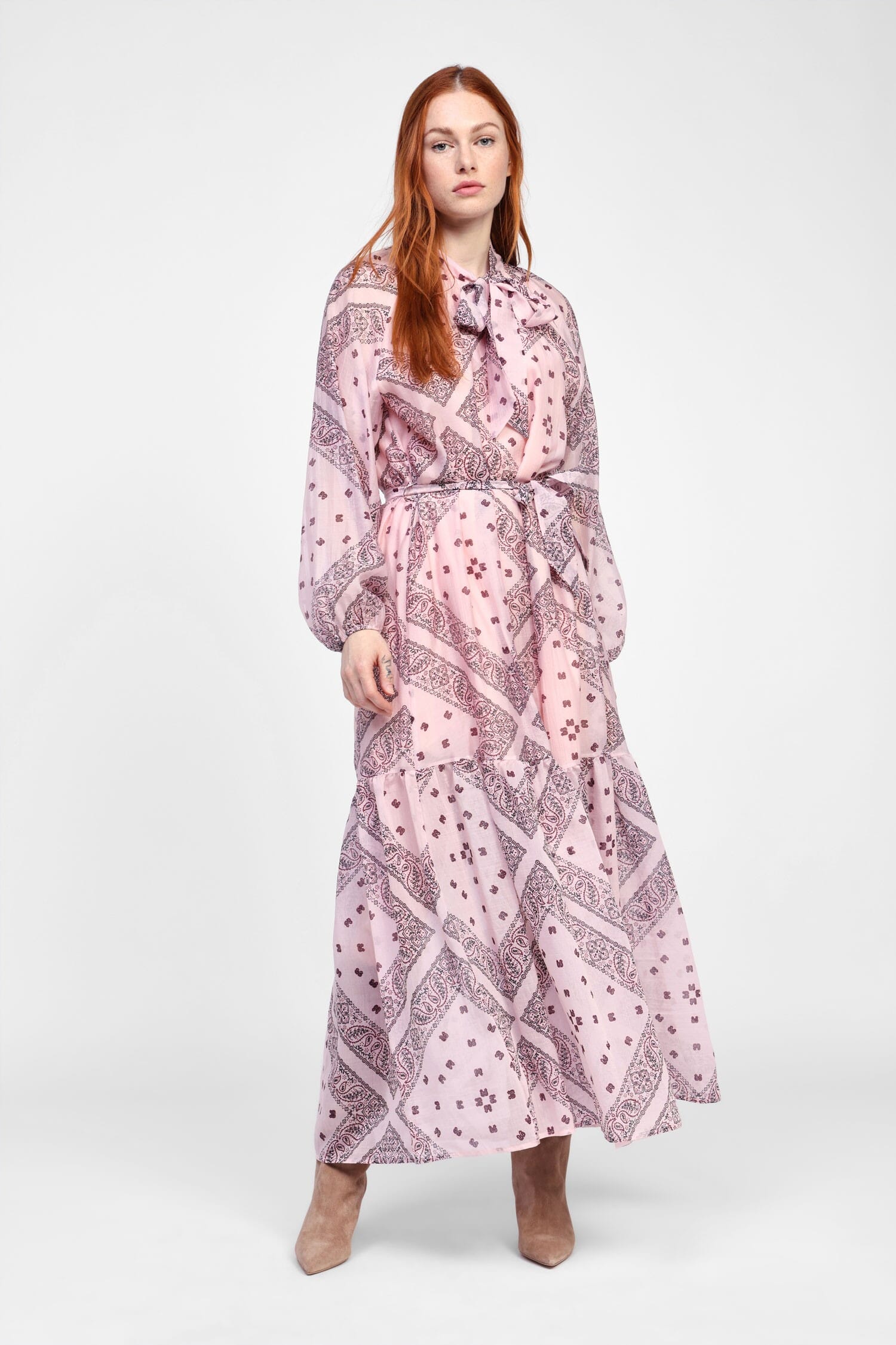 Questo abito lungo incarna un'eleganza pratica con un affascinante motivo stampato. Le maniche lunghe e la cintura coordinata aggiungono un tocco di grazia, mentre il taglio fluido permette un movimento libero e comodo durante le tue giornate. Perfetto per esaltare il tuo stile quotidiano con un tocco femminile e spensierato.