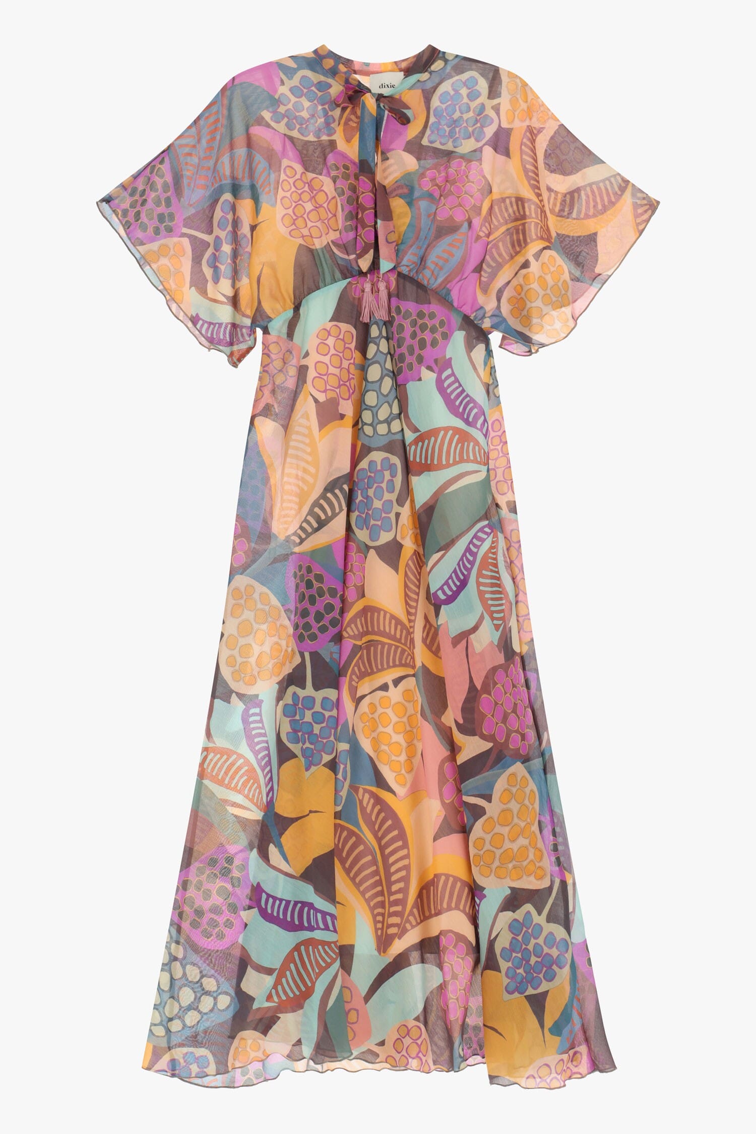 Un abito lungo che incanta con una stampa floreale vivace, perfetto per le giornate estive o serate all'aperto. Le maniche ampie donano comfort e una silhouette ariosa, mentre la vita leggermente ripresa esalta le forme femminili con grazia. Un dettaglio di chiusura al collo aggiunge un tocco personale e raffinato.