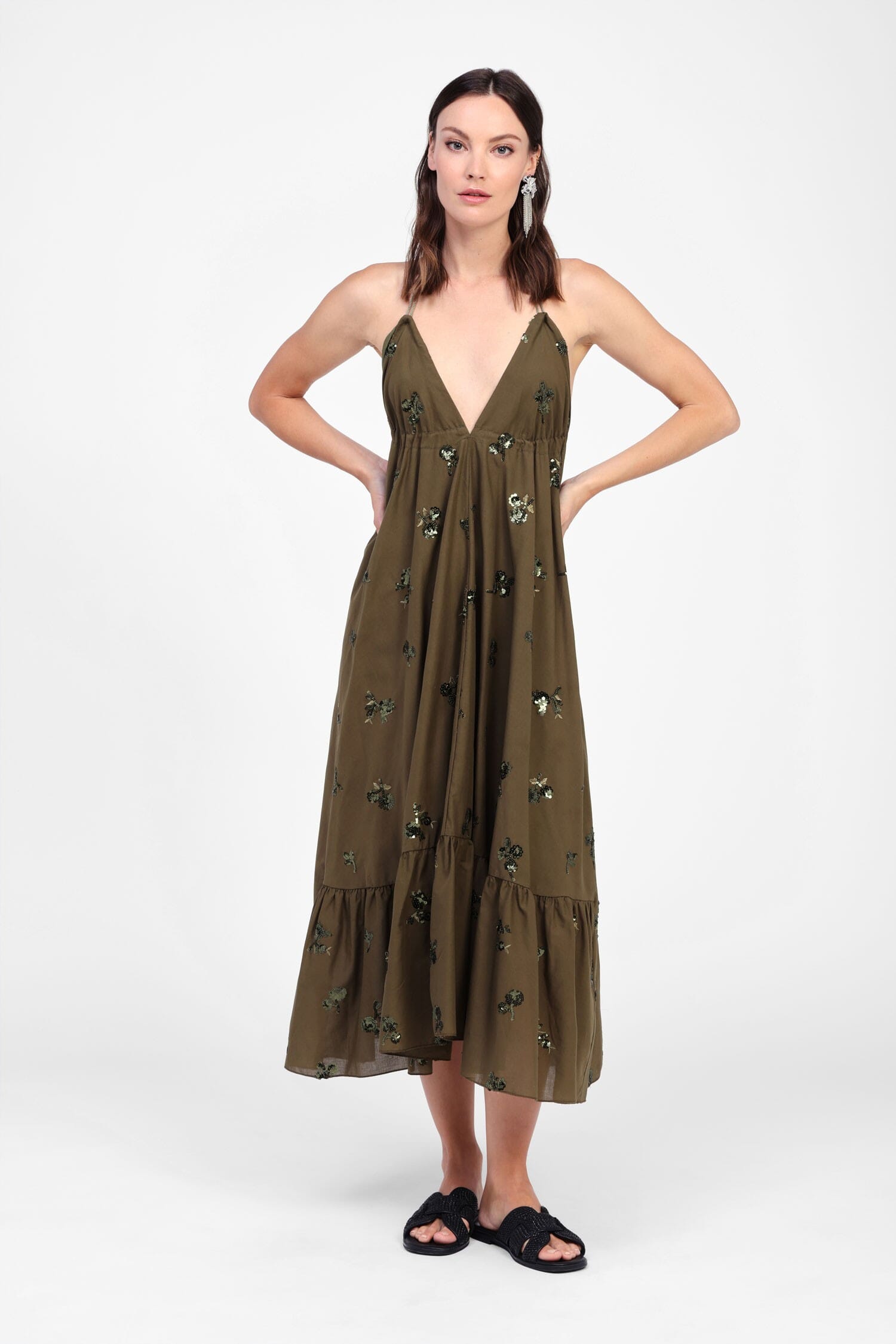 Immergiti in un sogno di femminilità con questo abito lungo che avvolge delicatamente la silhouette. I dettagli floreali ricamati conferiscono un tocco di romanticismo, mentre i lacci sottili sulle spalle si traducono in un'eleganza quotidiana. Perfetto per eventi all'aperto, trasmette una sensazione di freschezza e confort senza sforzo.