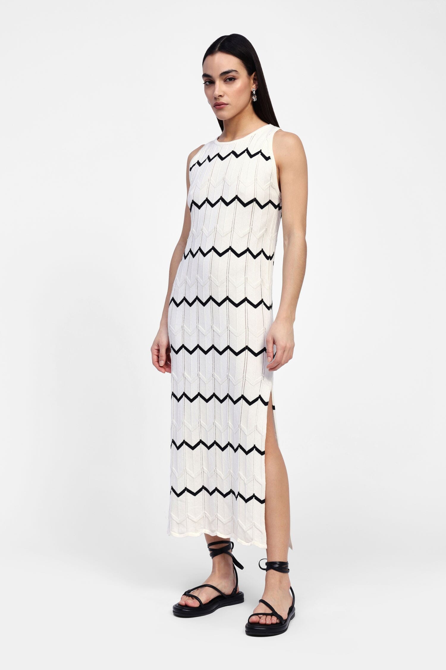 Abbandonati alla bellezza senza tempo di questo abito lungo, perfetto per donne che amano distinguersi con un tocco di raffinatezza. Le linee geometriche giocano con il design, mentre l'assenza di maniche e la scollatura rotonda conferiscono leggerezza e un tocco moderno. Perfetto per una giornata all'insegna dello stile e della creatività.