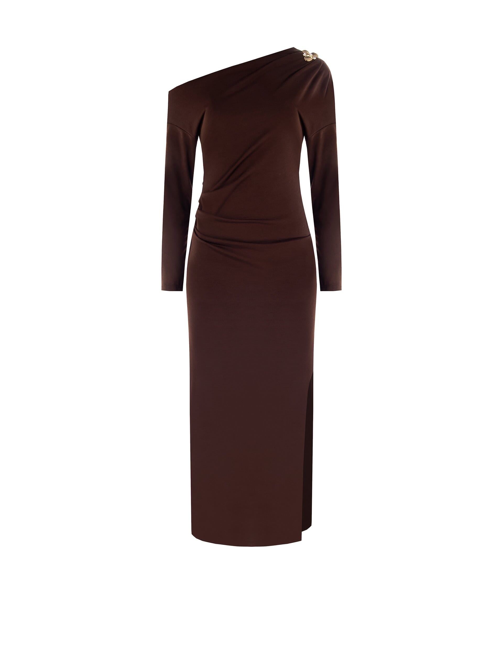 Linea lunga e fasciante in morbido jersey stretch che avvolge la silhouette con comfort. Scollo monospalla impreziosito da dettaglio gioiello e spacco laterale che slancia la gamba. Perfetta per party e cene speciali, con sandali o décolleté.