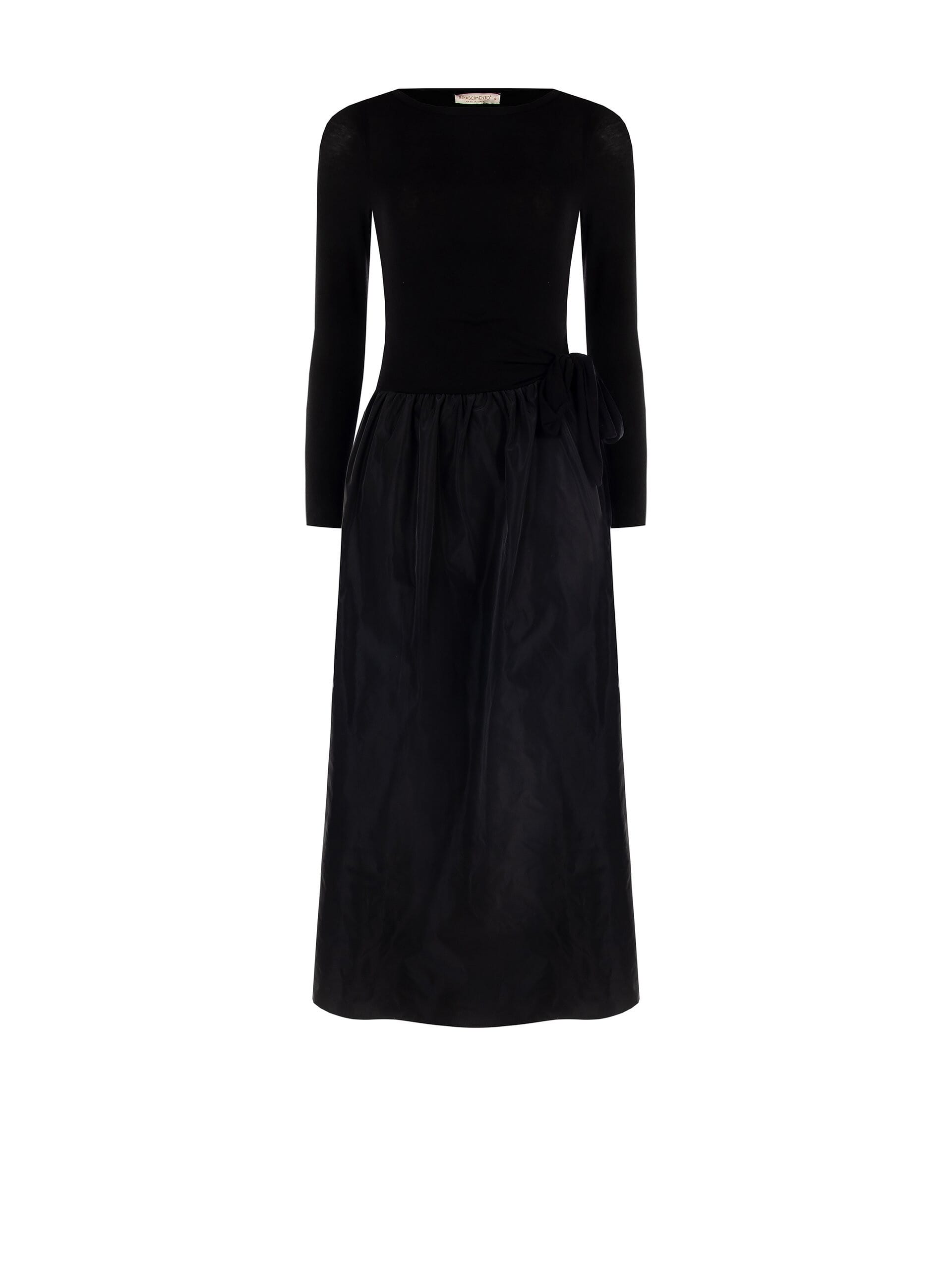 Firmato Rinascimento: silhouette midi con top aderente in jersey morbido e gonna in taffetà leggero per un fit femminile che slancia. Scollo rotondo, maniche lunghe e nodo laterale che definisce il punto vita. Versatile dal giorno alla sera: impeccabile in ufficio con blazer, perfetto per cene ed eventi con un tacco.