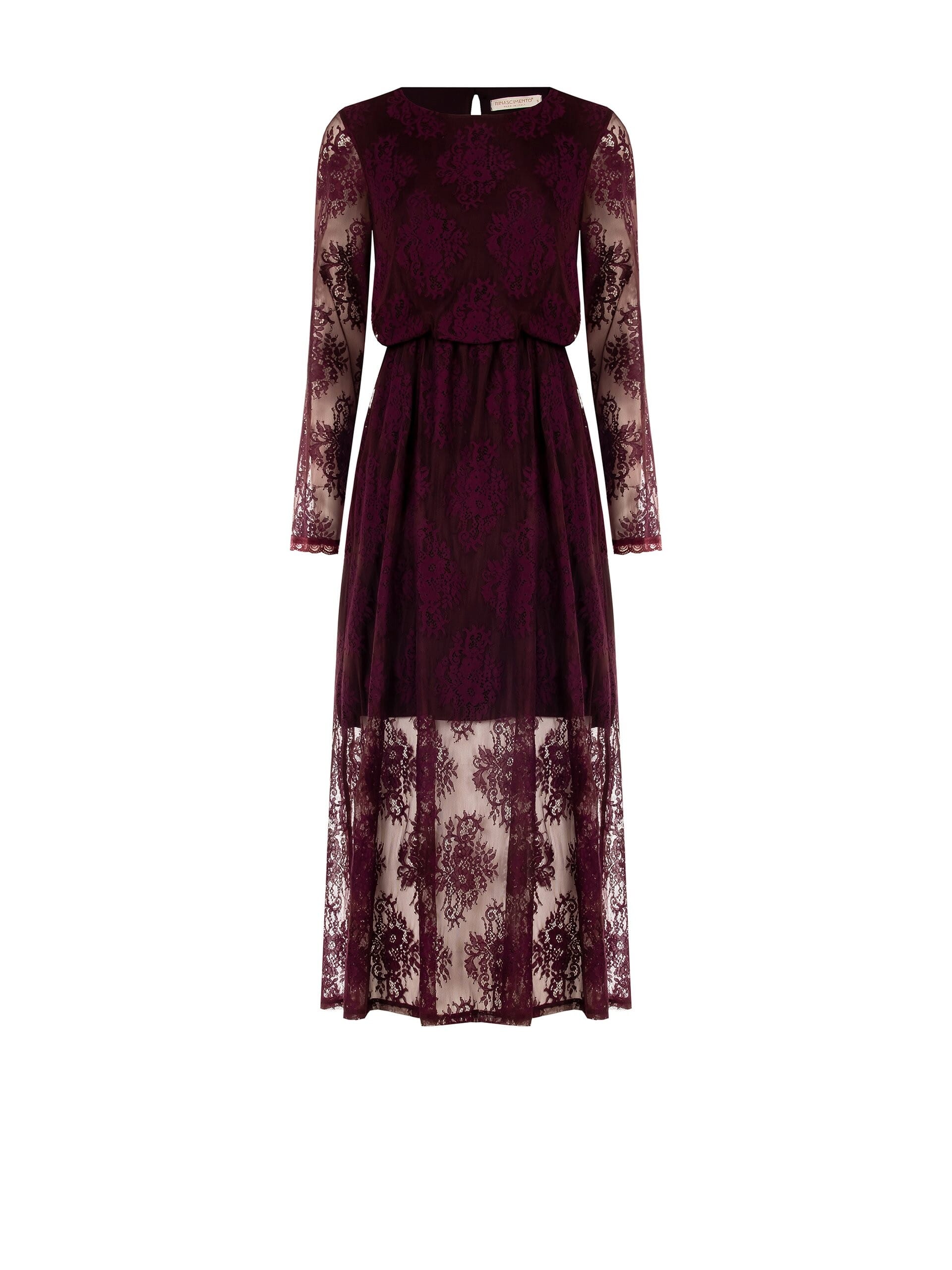 Rinascimento firma un midi dalla linea morbida e vita sottolineata, che valorizza la silhouette senza costringere. Tulle e pizzo a motivo floreale con maniche velate, gonna con inserto semitrasparente e piccolo oblò sulla nuca. Elegante ma pratico, perfetto per cerimonie, party e cene speciali.