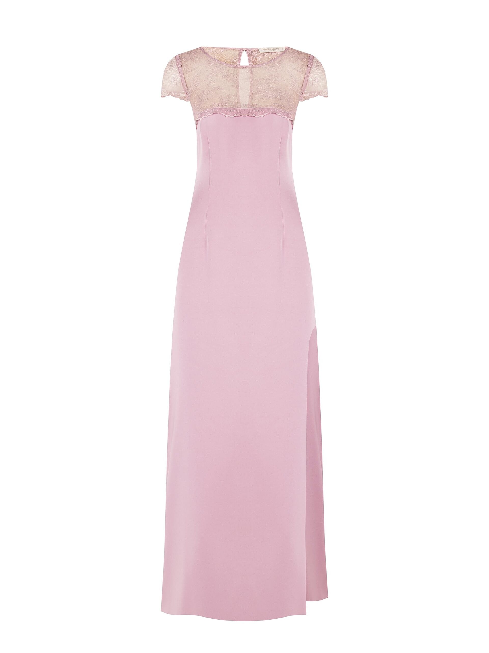 Abito lungo dal fit scivolato che snellisce la silhouette. Corpino in crêpe fluido, impalpabile inserti in pizzo effetto illusione sulle spalle e micro maniche. Spacco laterale per libertà di movimento; chiusura a goccia sul retro. Perfetto per cerimonie, party e occasioni speciali, con comfort che dura tutta la sera.
