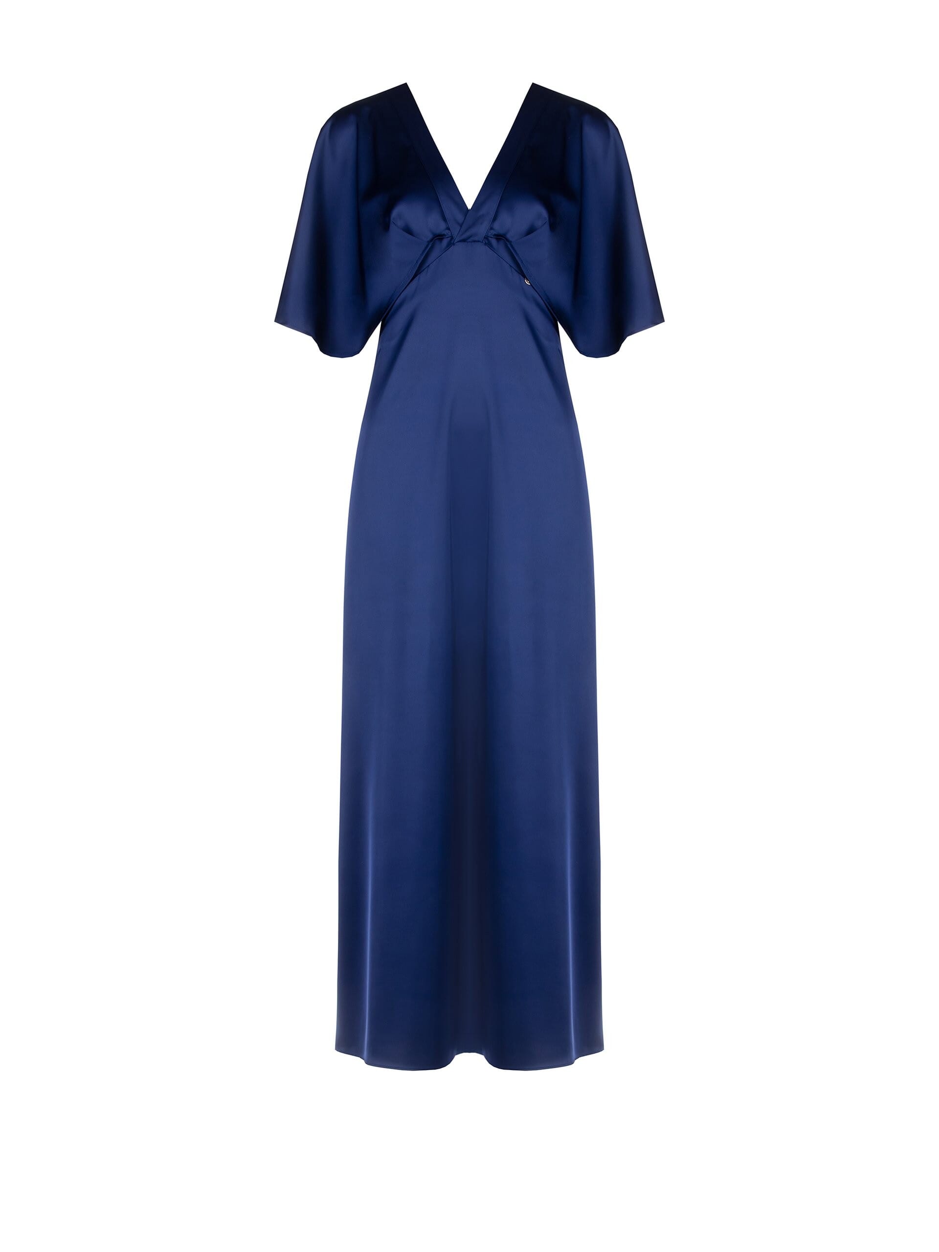 Abito lungo Rinascimento, fit scivolato che slancia la silhouette. Raso fluido e leggero, piacevole sulla pelle. Scollo a V davanti e dietro con dettaglio incrociato sotto il seno, maniche a kimono che coprono con eleganza. Perfetto per cerimonie, party e cene speciali: comfort e movimento a ogni passo.