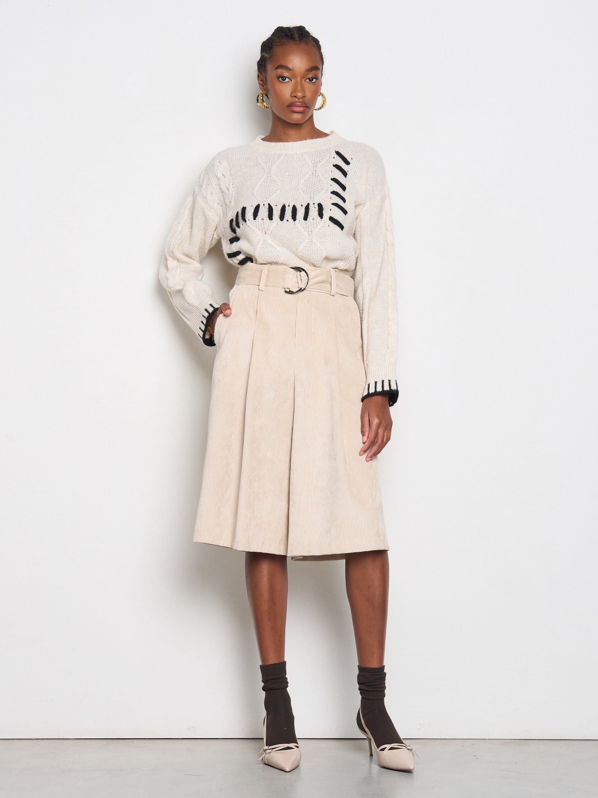 Rinascimento firma un bermuda morbido e ampio, a vita alta, che slancia la silhouette senza rinunciare al comfort. Realizzato in velluto a coste dalla mano soffice, è definito da pinces frontali e cintura con fibbia metallica. Versatile dal giorno alla sera: perfetto in ufficio con blazer, ideale nel tempo libero con maglia e stivali.