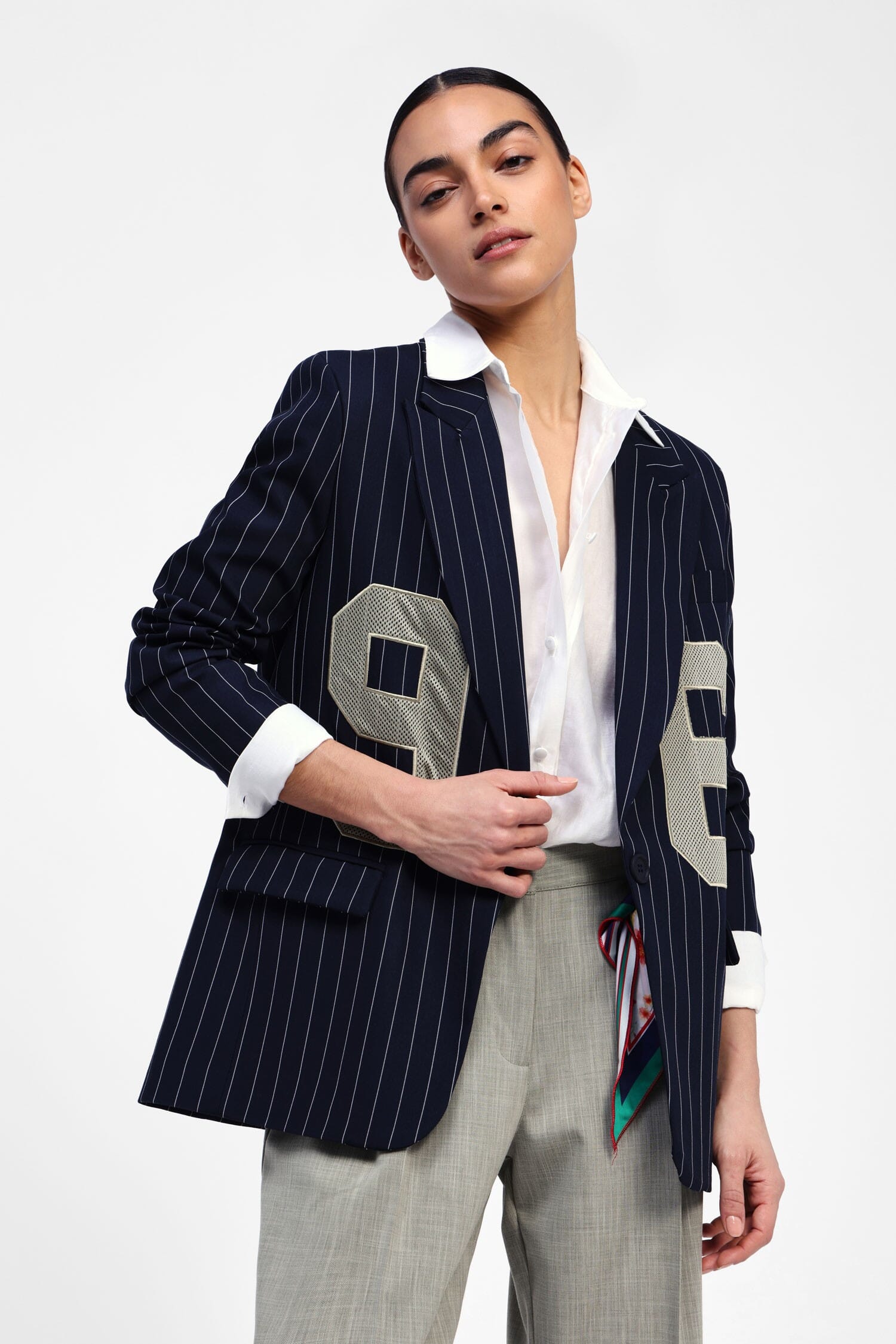 Blazer a righe con numeri Un blazer che esce dagli schemi, perfetto per chi ama distinguersi con dettagli inaspettati. Le righe verticali si sposano con l'audacia dei numeri applicati, creando un connubio tra classico e contemporaneo. Ideale per aggiungere un tocco di personalità al tuo guardaroba, si presta a innumerevoli abbinamenti creativi.