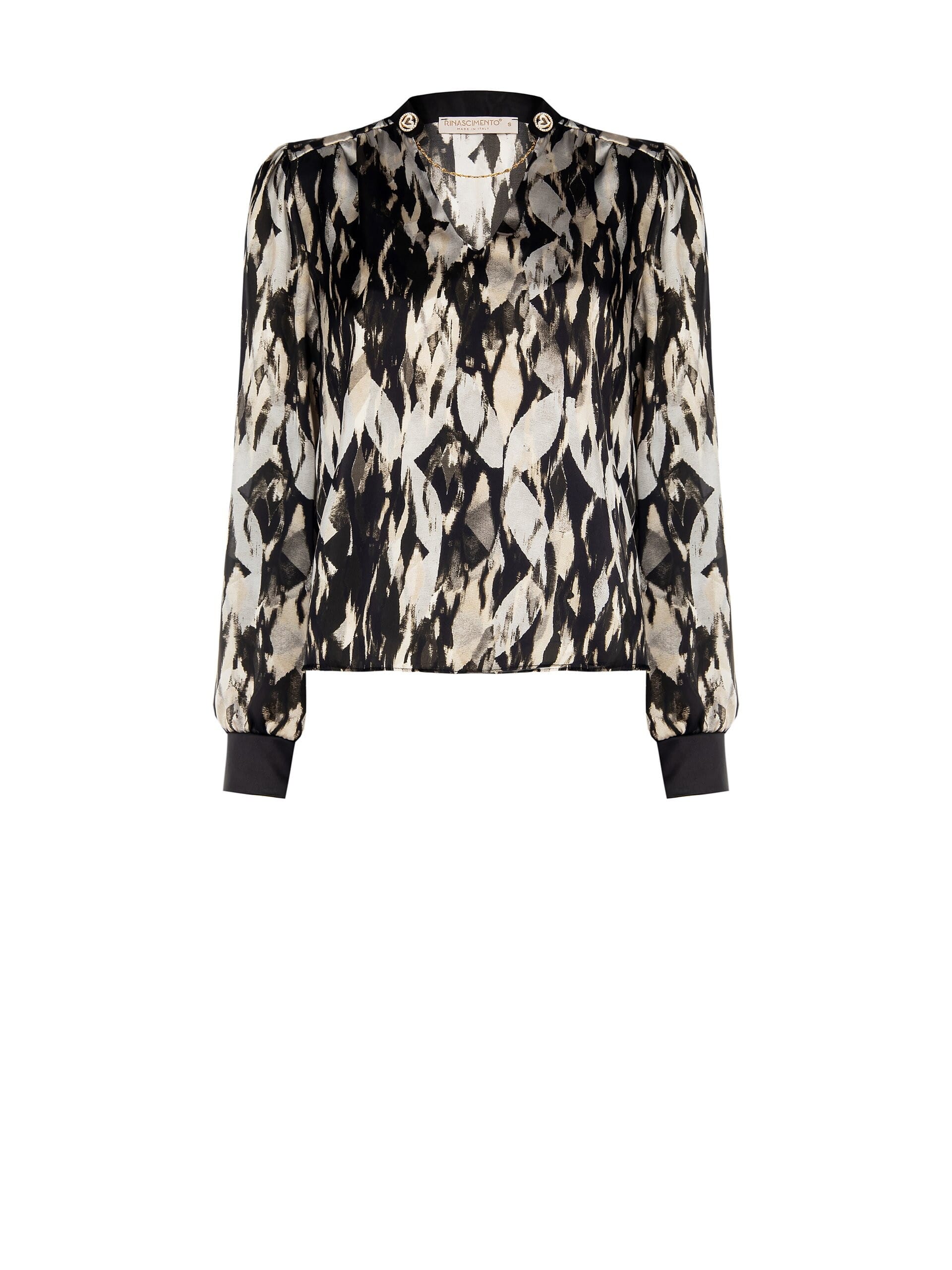 Top fluido in raso dalla linea morbida che accarezza la figura senza segnare. Il motivo astratto incontra il collo con scollo a V, bottoni gioiello e catena removibile per modulare lo stile. Perfetto con pantaloni tailoring per l’ufficio e subito dopo l’aperitivo.