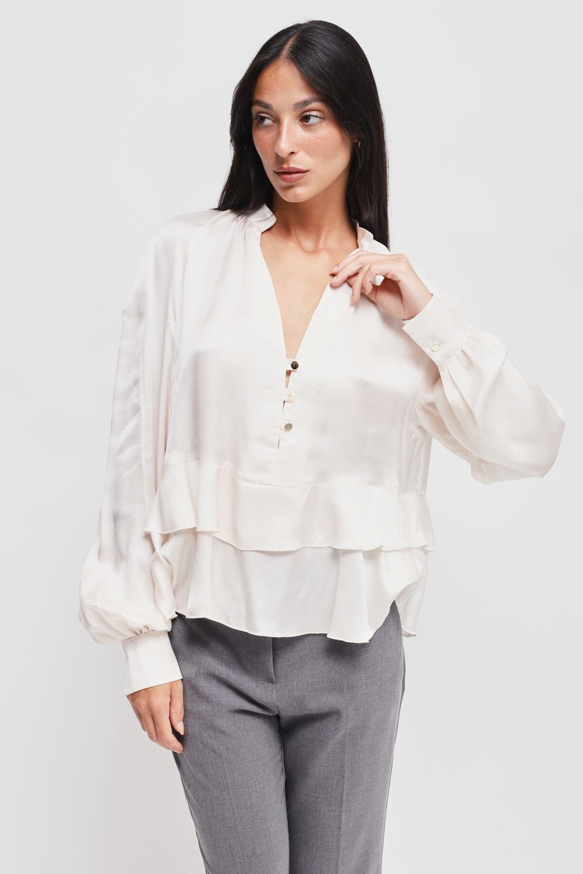 Blusa realizzata in raso lucido, caratterizzata da un taglio svasato e voluminose ruches sul fondo, con scollo a V e maniche lunghe a sbuffo con polsino. Ideale per un outfit da sera o per un look business chic.
