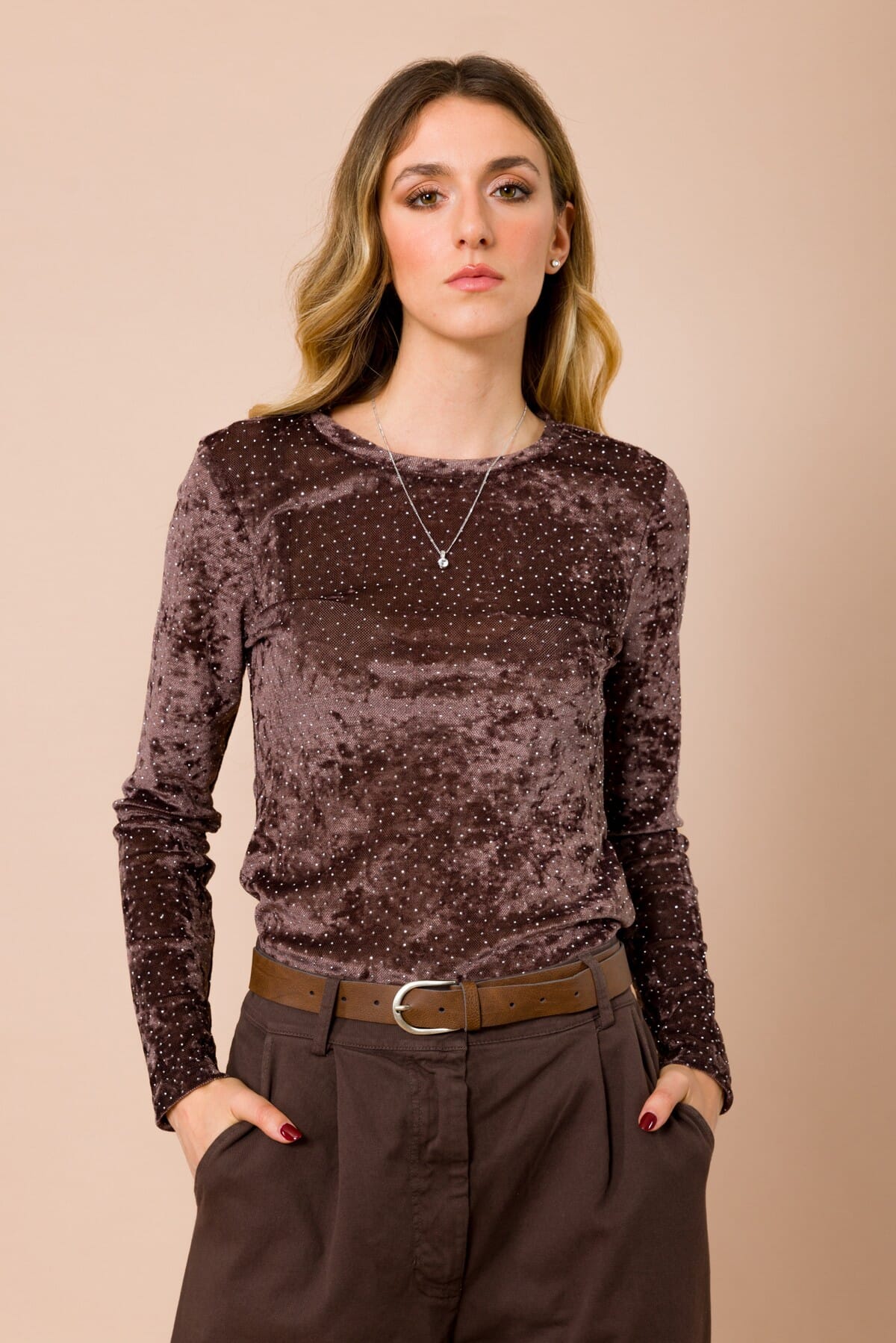 Maryley firma un top a maniche lunghe dal fit aderente che valorizza la silhouette con comfort. Morbido velluto effetto crushed e micro strass diffusi regalano luce discreta. Girocollo pulito e pannello superiore in tulle per un tocco sensuale. Perfetto con denim di giorno, con tailoring o gonna per party e dinner.
