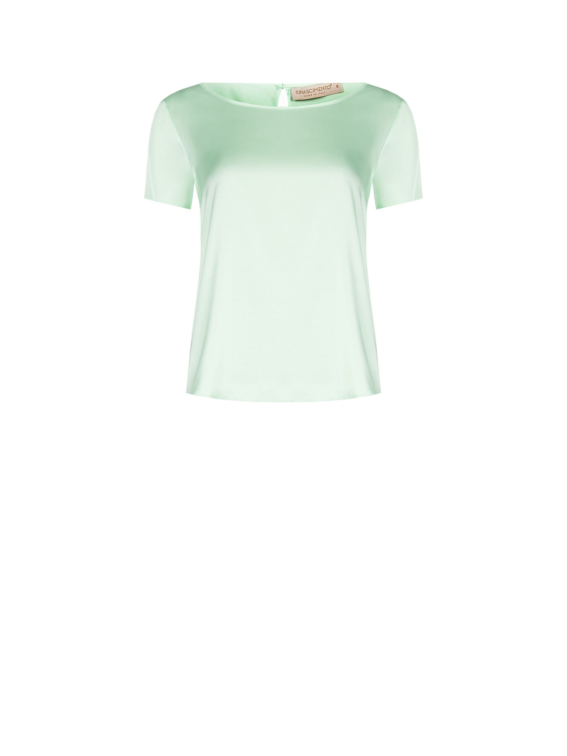 Top a maniche corte dal fit morbido e femminile, in tessuto fluido leggermente lucido che accarezza la silhouette. Scollo tondo essenziale e apertura a goccia sul retro con piccolo bottone. Perfetto da indossare in ufficio o tutti i giorni con pantaloni e gonne.