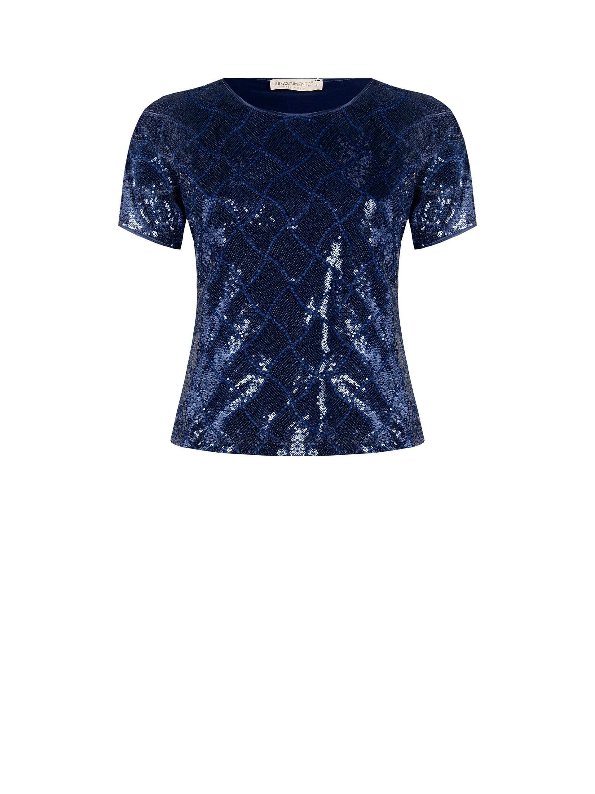 Top a maniche corte dal fit dritto e confortevole, in morbido jersey stretch interamente ricamato di paillettes a motivo geometrico. Lo scollo tondo pulito e il piccolo dettaglio gioiello sul retro slanciano la silhouette. Perfetto per party e serate speciali.