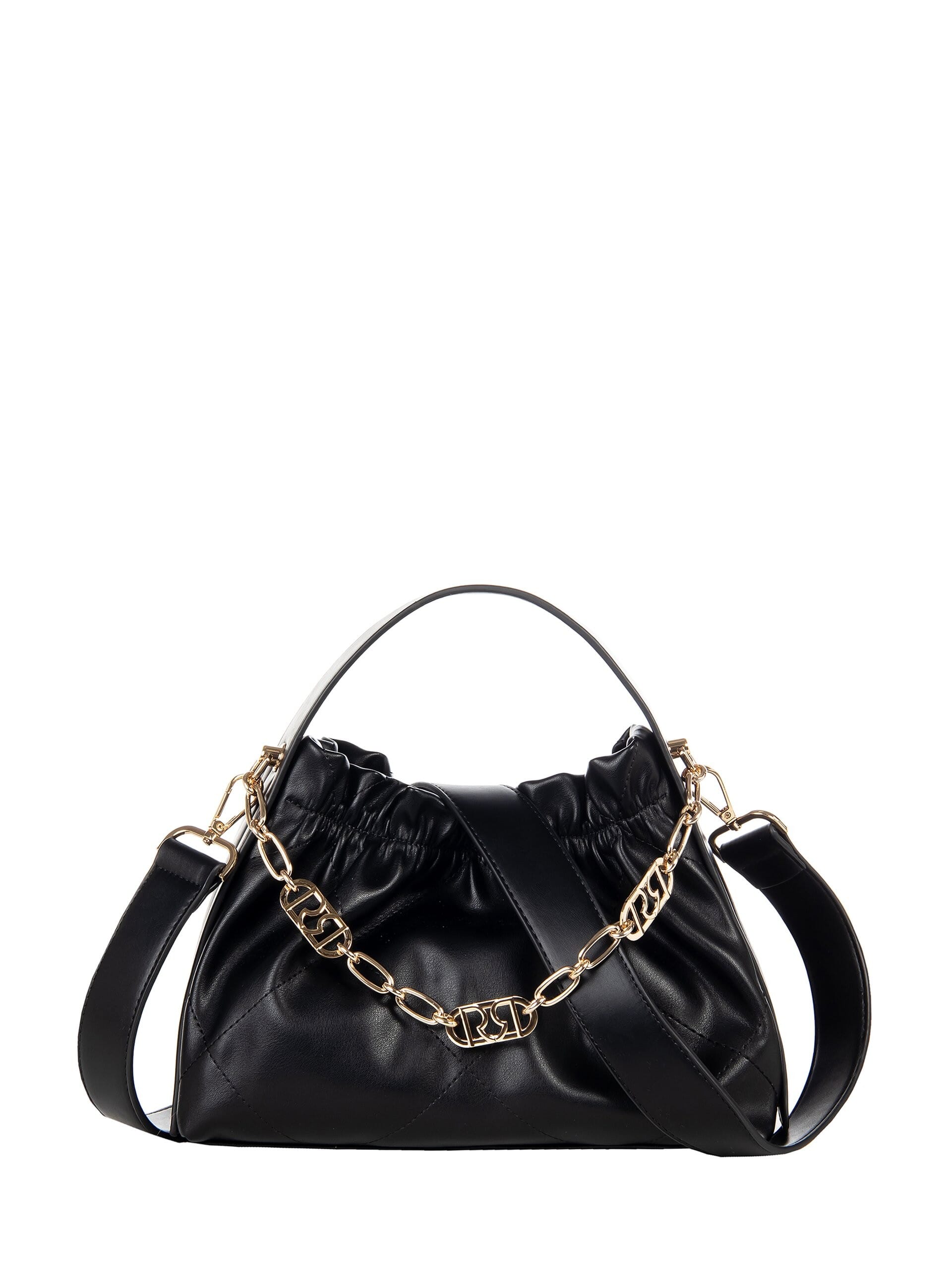 Borsa a spalla dal volume morbido e compatto, effetto pouch. Realizzata in similpelle trapuntata con mano soffice. Catena gioiello con logo e tracolla removibile per portabilità a mano o crossbody. Chiusura arricciata con coulisse interna. Ideale dall’ufficio all’aperitivo, aggiunge carattere a ogni look.