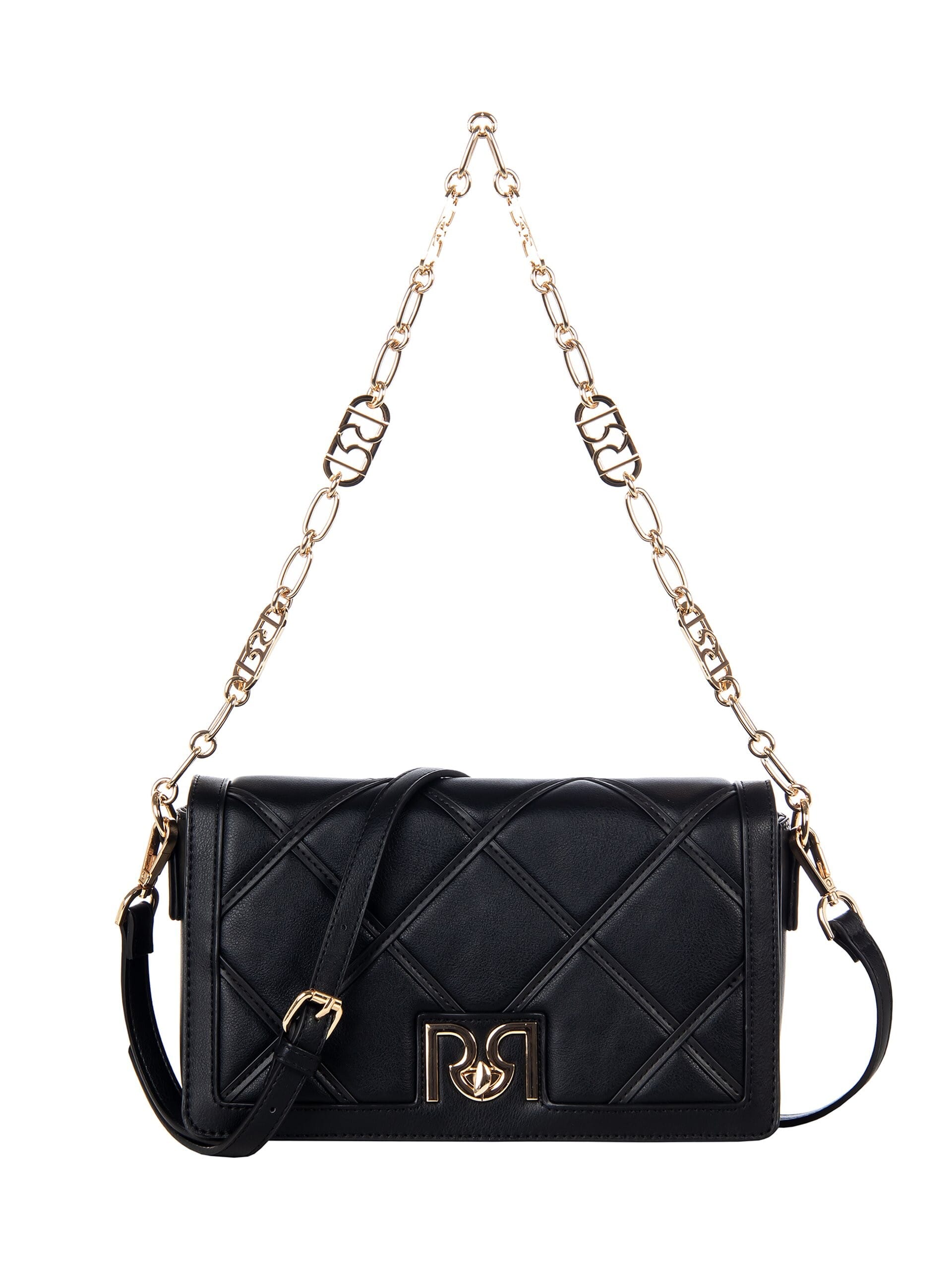 Mini bag a spalla, silhouette compatta e strutturata. Morbida similpelle con trapuntatura geometrica per un tocco tattile. Chiusura con logo metallico e doppia portabilità: catena gioiello o tracolla regolabile e removibile. Capienza essenziale per telefono e piccoli must. Perfetta da giorno all’aperitivo.