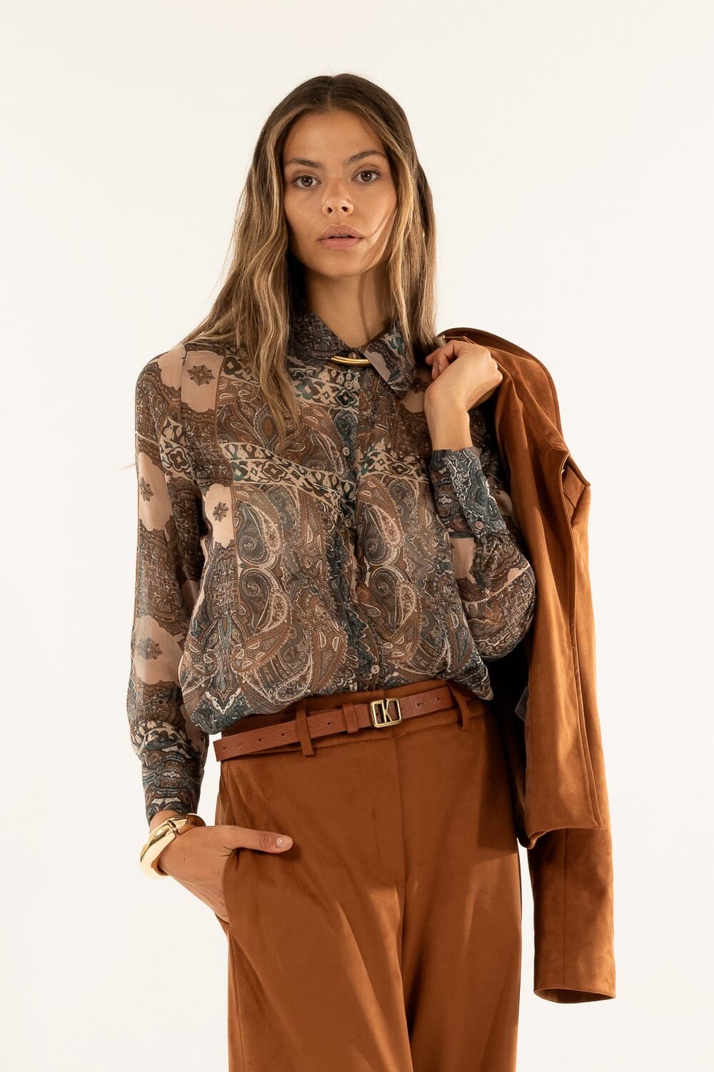 Kontatto reinterpreta la blusa dal taglio dritto e fluido, leggera sulla pelle. Tessuto voile semi‑trasparente con stampa paisley, piacevole al tatto e facile da infilare nei pantaloni. Colletto classico e abbottonatura nascosta, polsini con spacchetto. Perfetta per l’ufficio con blazer, ideale anche per uscite serali.