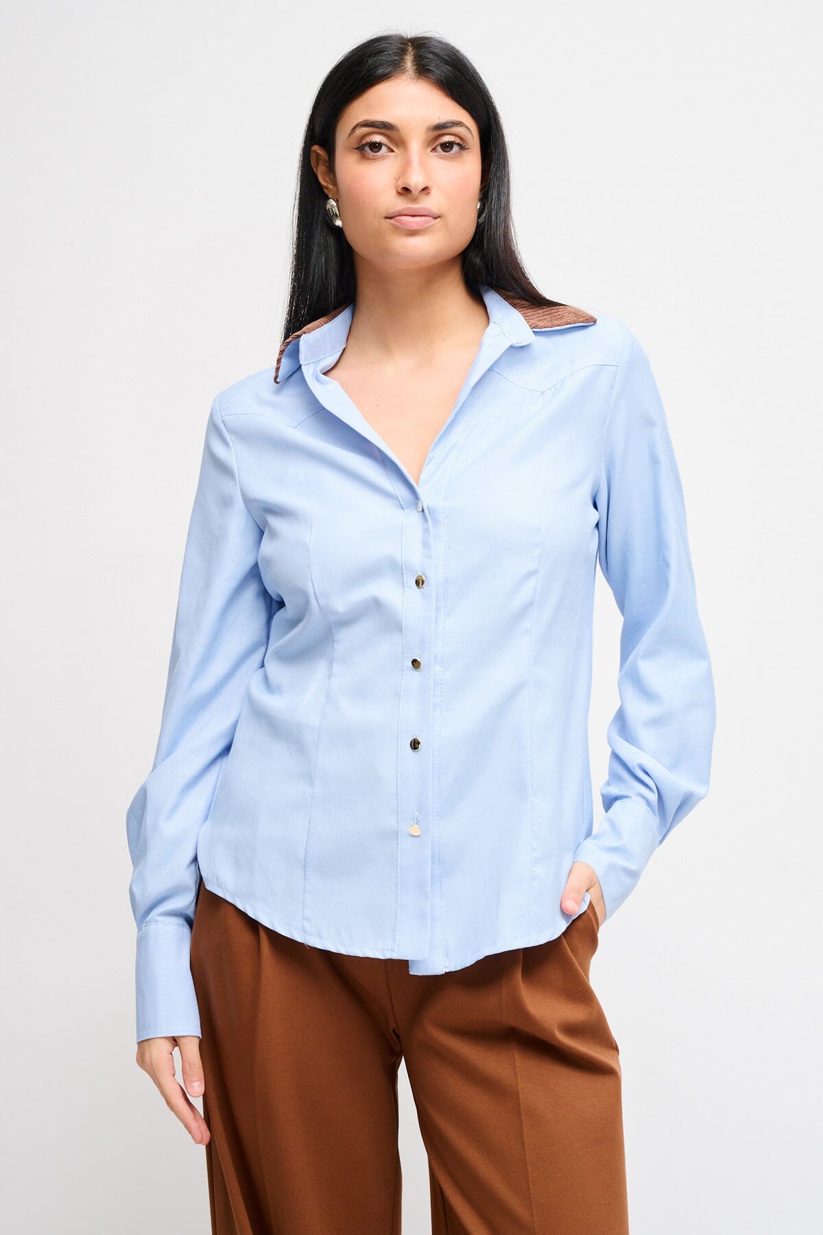 Maryley camicia dal fit aderente che scolpisce la silhouette senza costringere. Cotone leggero e morbido al tatto, bottoni metallici e colletto in velluto a costine a contrasto. Polsini doppi con chiusura gioiello. Perfetta per l’ufficio e per un everyday curato, facile da abbinare anche sotto blazer.