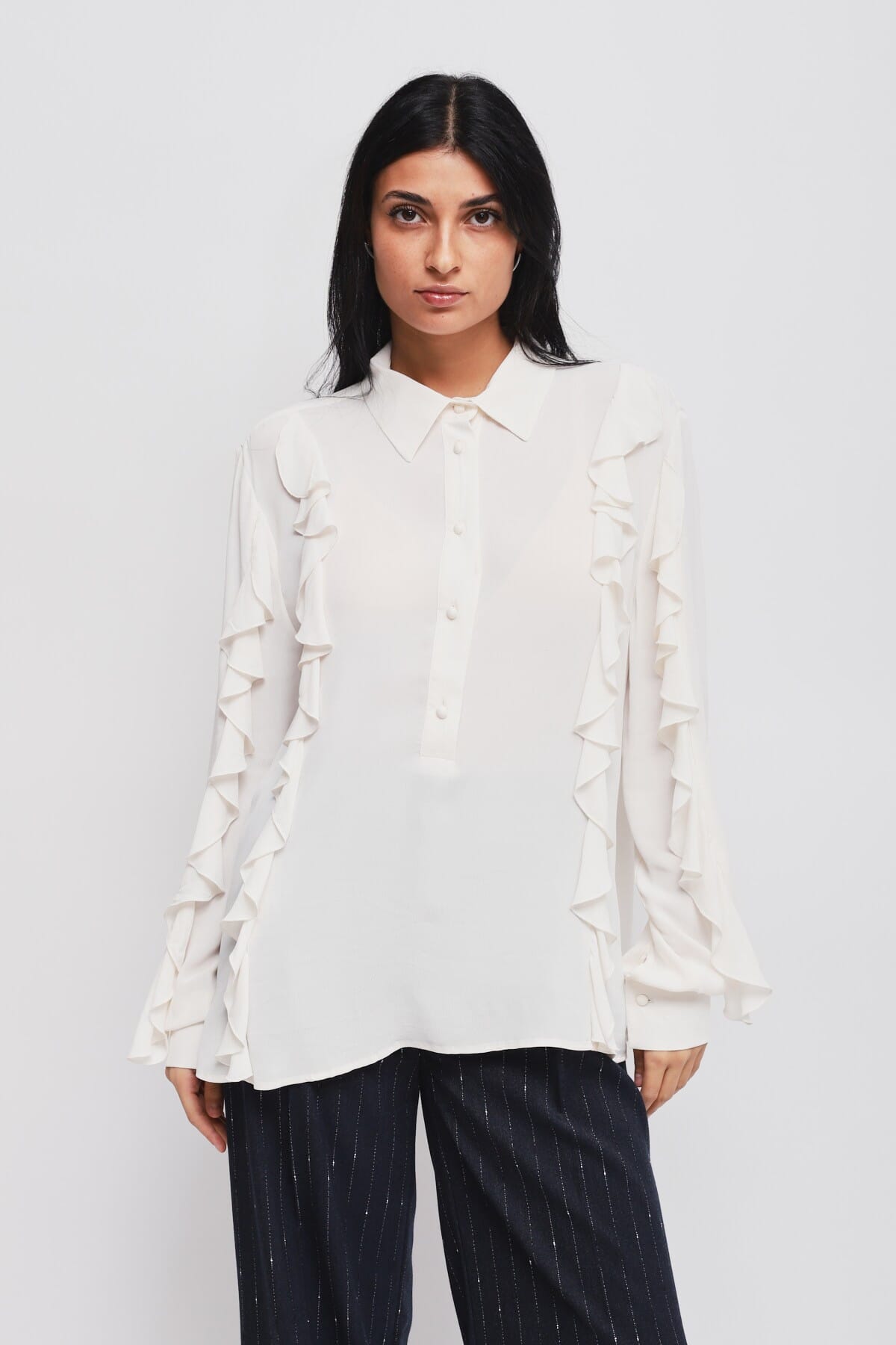 Blusa Maryley dal fit morbido e fluido, in viscosa leggera dal tocco setoso. Le rouches lungo spalle e maniche slanciano la silhouette, mentre l’abbottonatura a vista con bottoni rivestiti e polsini strutturati aggiungono carattere. Perfetta per l’ufficio con tailleur, ideale anche per aperitivi ed eventi serali.