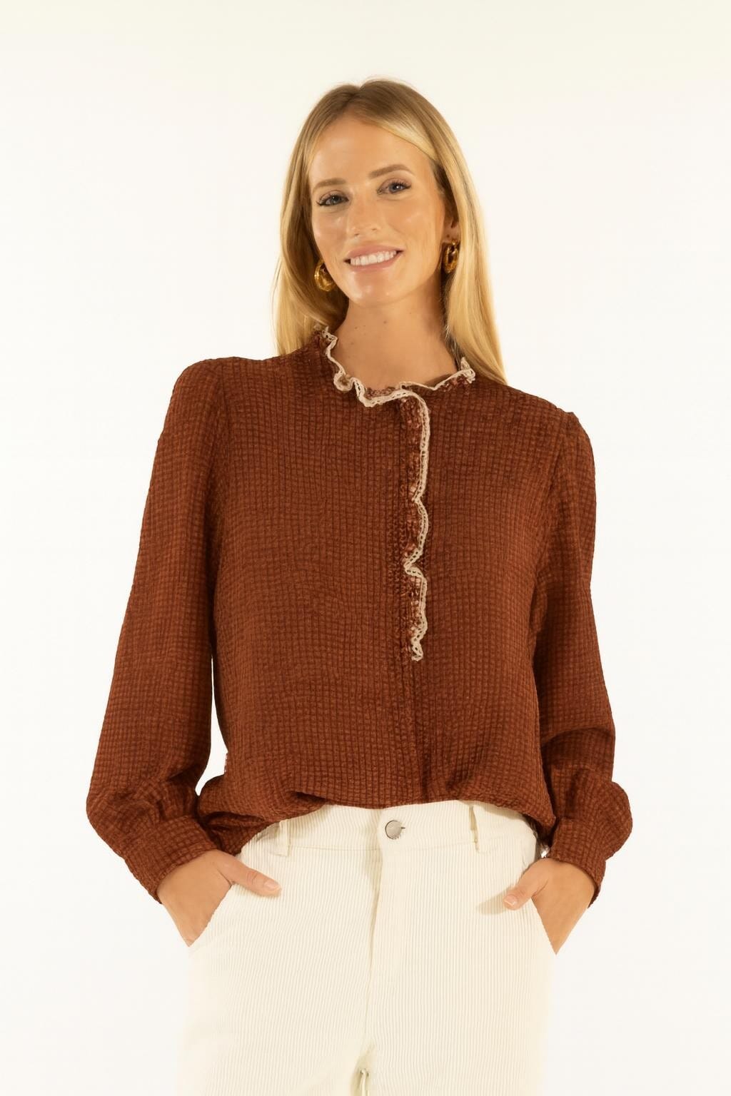 Blusa Kontatto dal fit morbido e femminile, in viscosa leggerissima con mano fluida. La passamaneria arricciata incornicia il girocollo e scende sul davanti, mentre le maniche con polsino donano equilibrio alla silhouette. Versatile da ufficio a everyday: comoda da infilare nei pantaloni o portare sciolta.