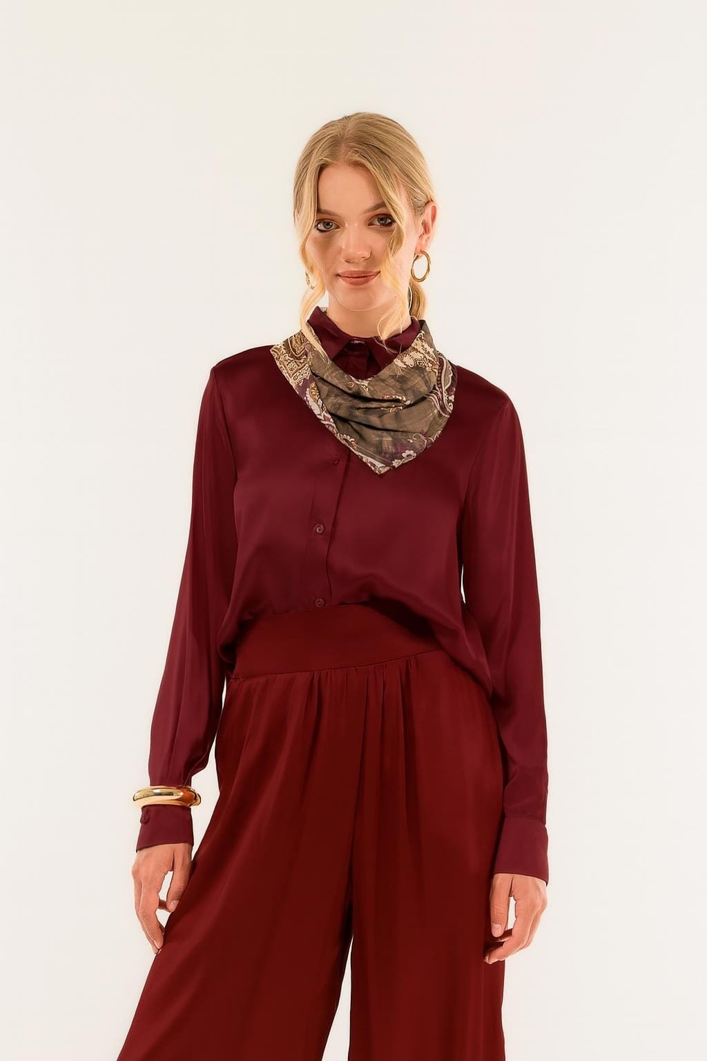Avvolgente come una carezza, questa camicia dal tocco setoso conquista con il suo taglio morbido ed essenziale. Il foulard integrato aggiunge un dettaglio sofisticato, perfetto per distinguersi in ogni occasione con grazia e stile senza tempo.
