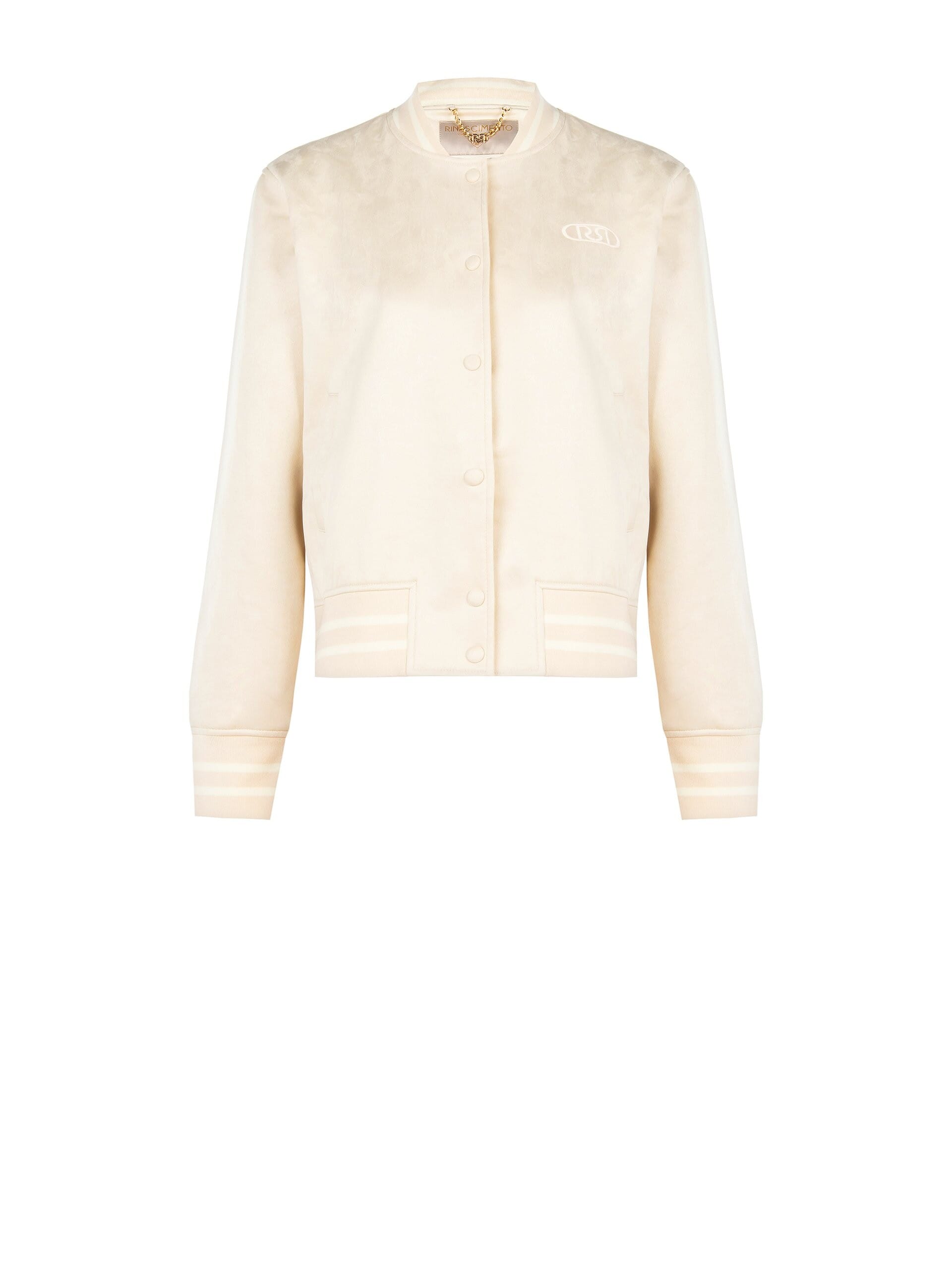 Giacca corta dalla linea morbida, in similpelle effetto scamosciato che accarezza la silhouette. Collo e bordi a costine, bottoni automatici e logo ricamato sul petto aggiungono un tocco sporty‑chic. Perfetta su denim e abiti midi per l’ufficio e il tempo libero.