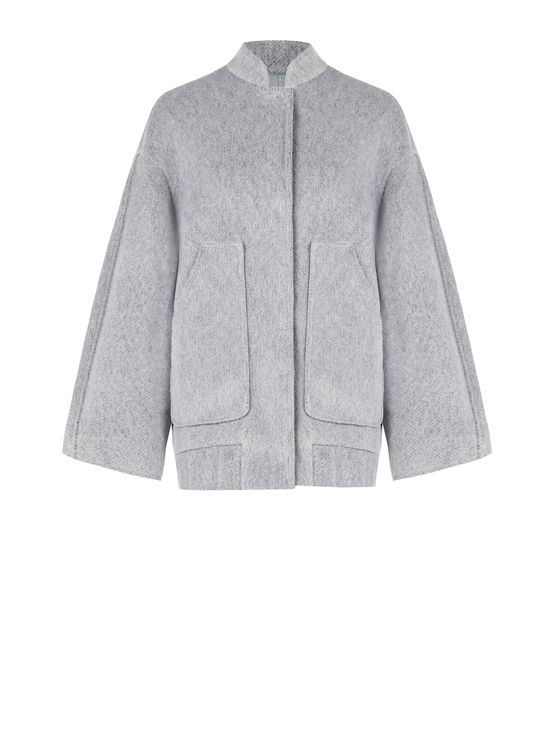 Giacca outerwear dal fit morbido e avvolgente, in tessuto effetto lana dalla texture soffice e strutturata. Il collo alto essenziale e le maxi tasche applicate aggiungono carattere e praticità, valorizzando la silhouette. Perfetta per ufficio, everyday e city look curati.