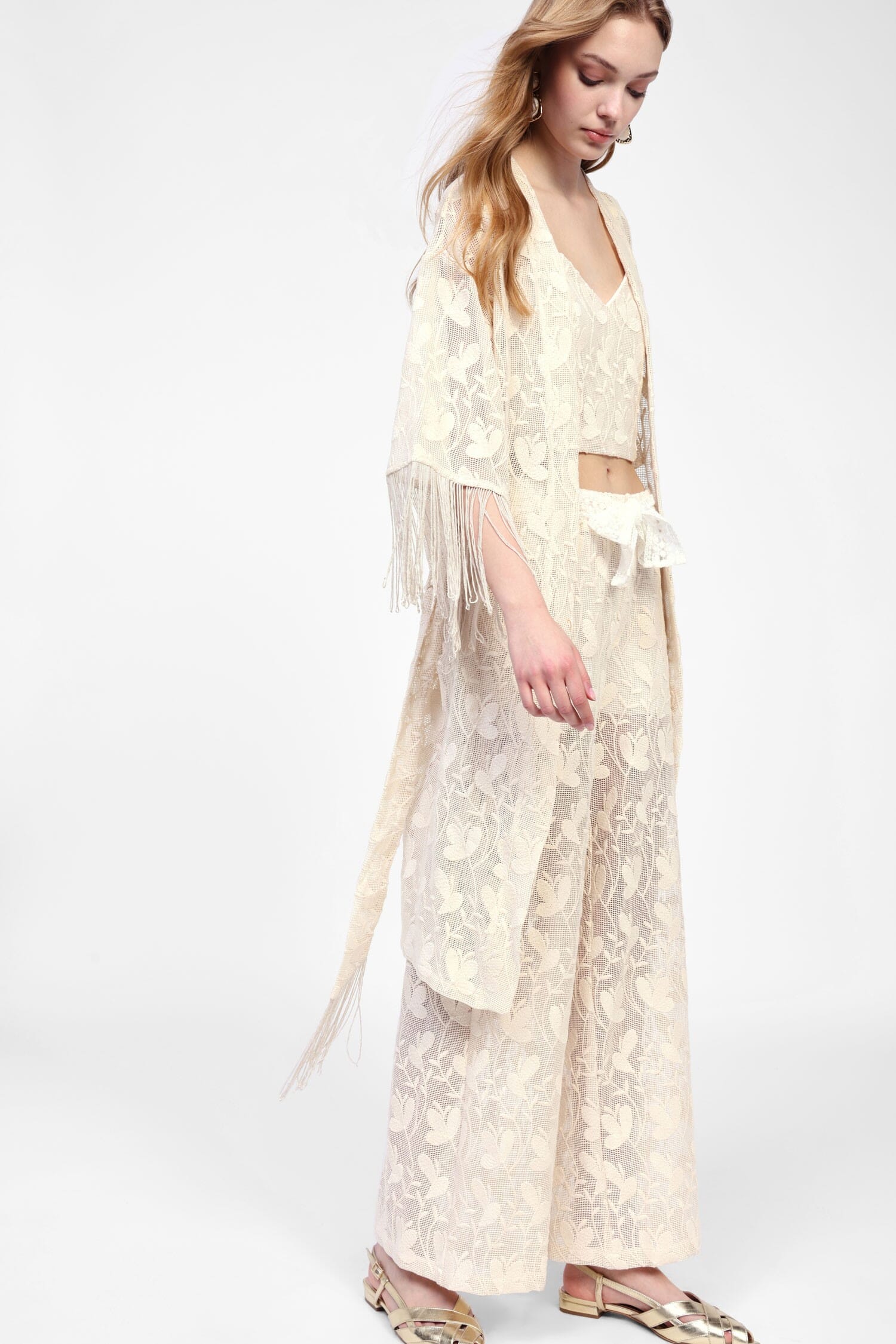 Lasciati avvolgere dal fascino senza tempo di questo cappotto, caratterizzato da dettagli a frange che danzano con grazia ad ogni passo. Una cintura in vita aggiunge un tocco di raffinatezza e definisce elegantemente la silhouette. Perfetto per transizioni stagionali, questo capo versatile completa sia look da giorno che serali con una leggerezza impareggiabile.