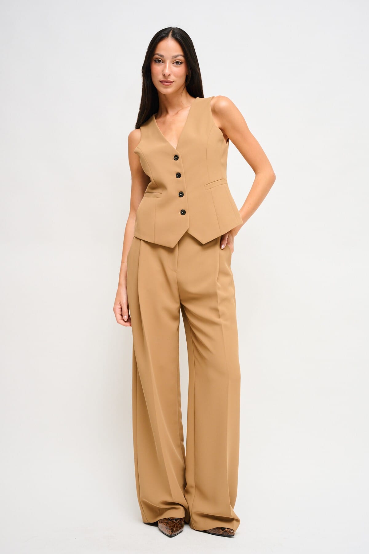 Completo composto da gilet con chiusura a bottoni e pantaloni palazzo a vita alta. Ideale per contesti formali, professionali o cerimonie.