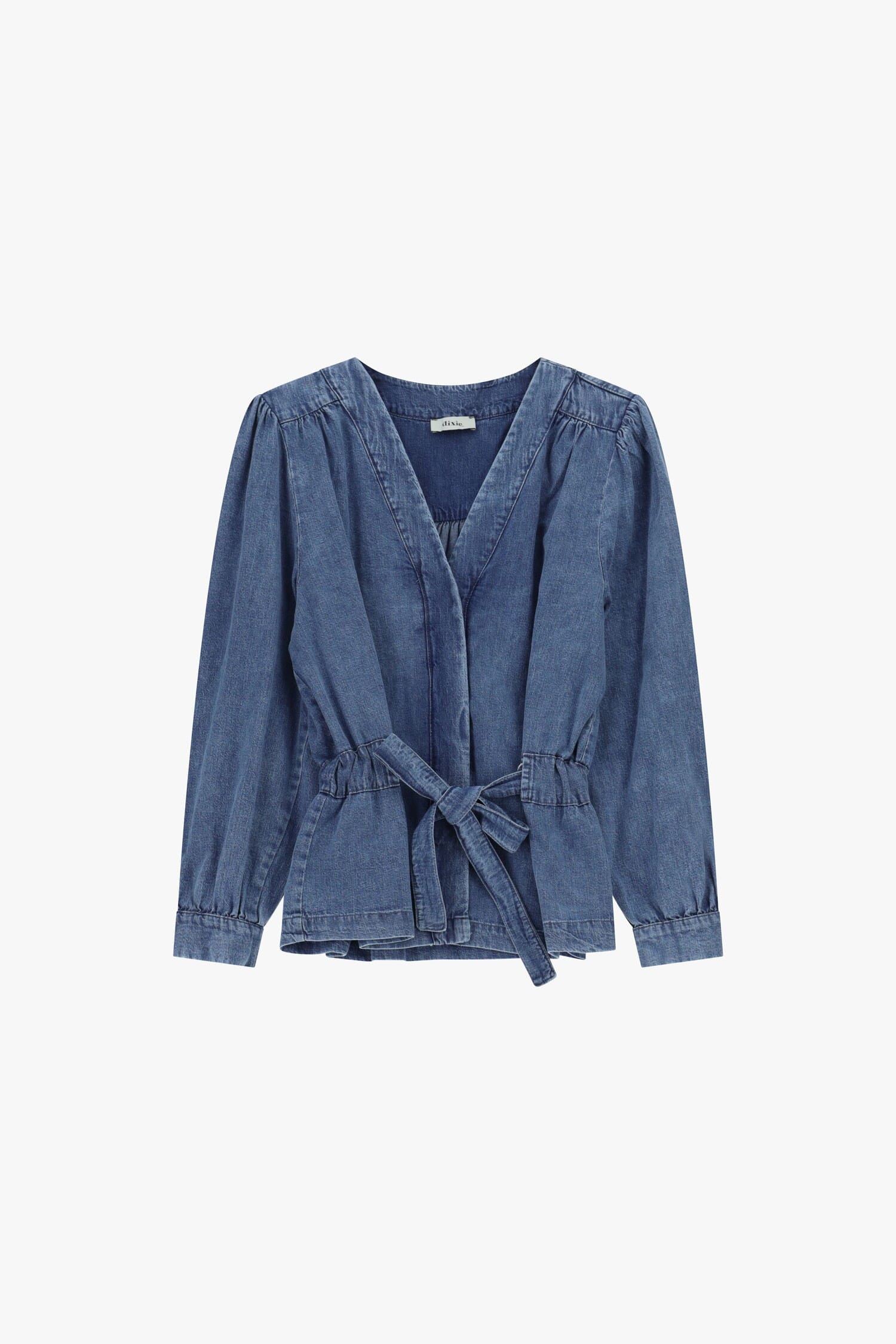 Questo outer jacket in denim presenta una linea femminile con scollo a v e cintura in vita, ideale per mettere in risalto la silhouette. Le maniche lunghe e le spalle leggermente arricciate donano un tocco originale, perfetto per ogni giorno. Facile da abbinare con abiti o pantaloni, si adatta a qualsiasi occasione.