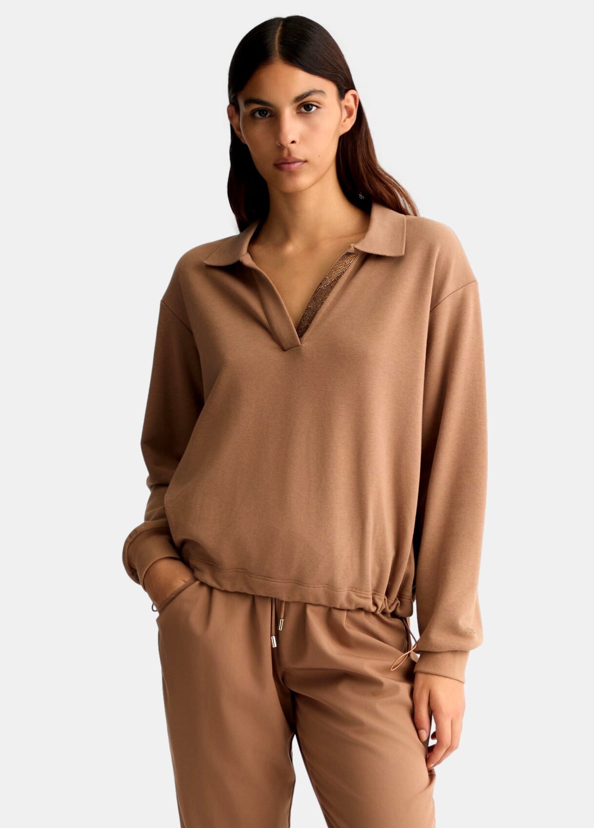 Felpa con strass,in misto cotone,tinta unita,scollo a V,colletto classico.