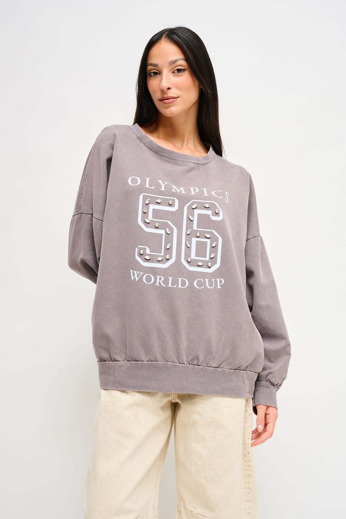 Maryley propone una felpa dal fit rilassato che valorizza con comfort. Morbido cotone spazzolato, mano soffice. Il numero frontale è illuminato da applicazioni gioiello e stampa college, mentre polsi e fondo elasticizzati definiscono la silhouette. Perfetta per everyday e tempo libero, con jeans o minigonna.
