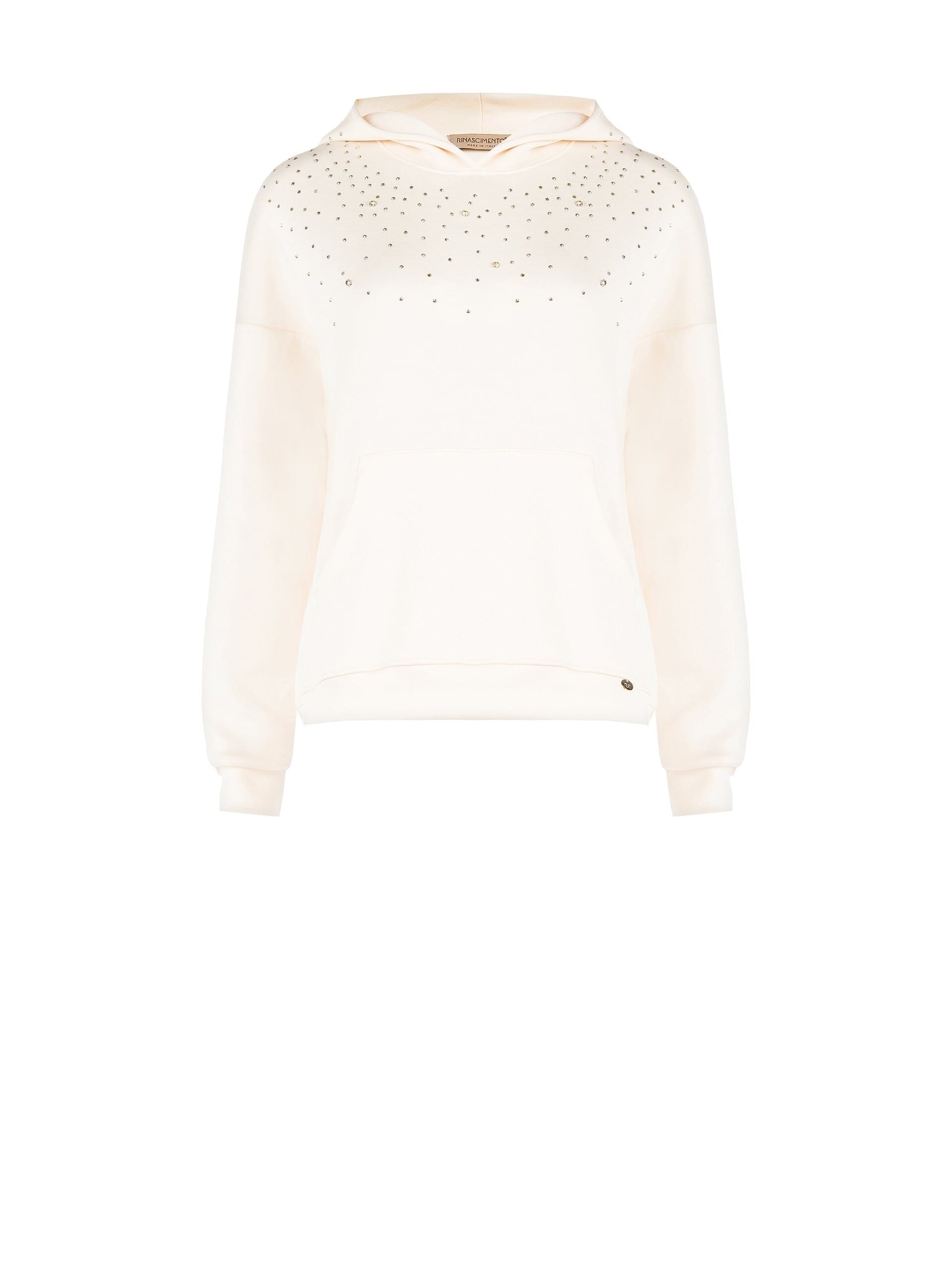 Sweatshirt Rinascimento dal fit morbido e leggermente corto, in jersey di cotone con interno felpato per comfort quotidiano. Cappuccio avvolgente, applicazione di micro-borchie e strass sul petto, tasca a marsupio. Perfetta per l’everyday con un tocco luminoso, dal brunch al tempo libero.