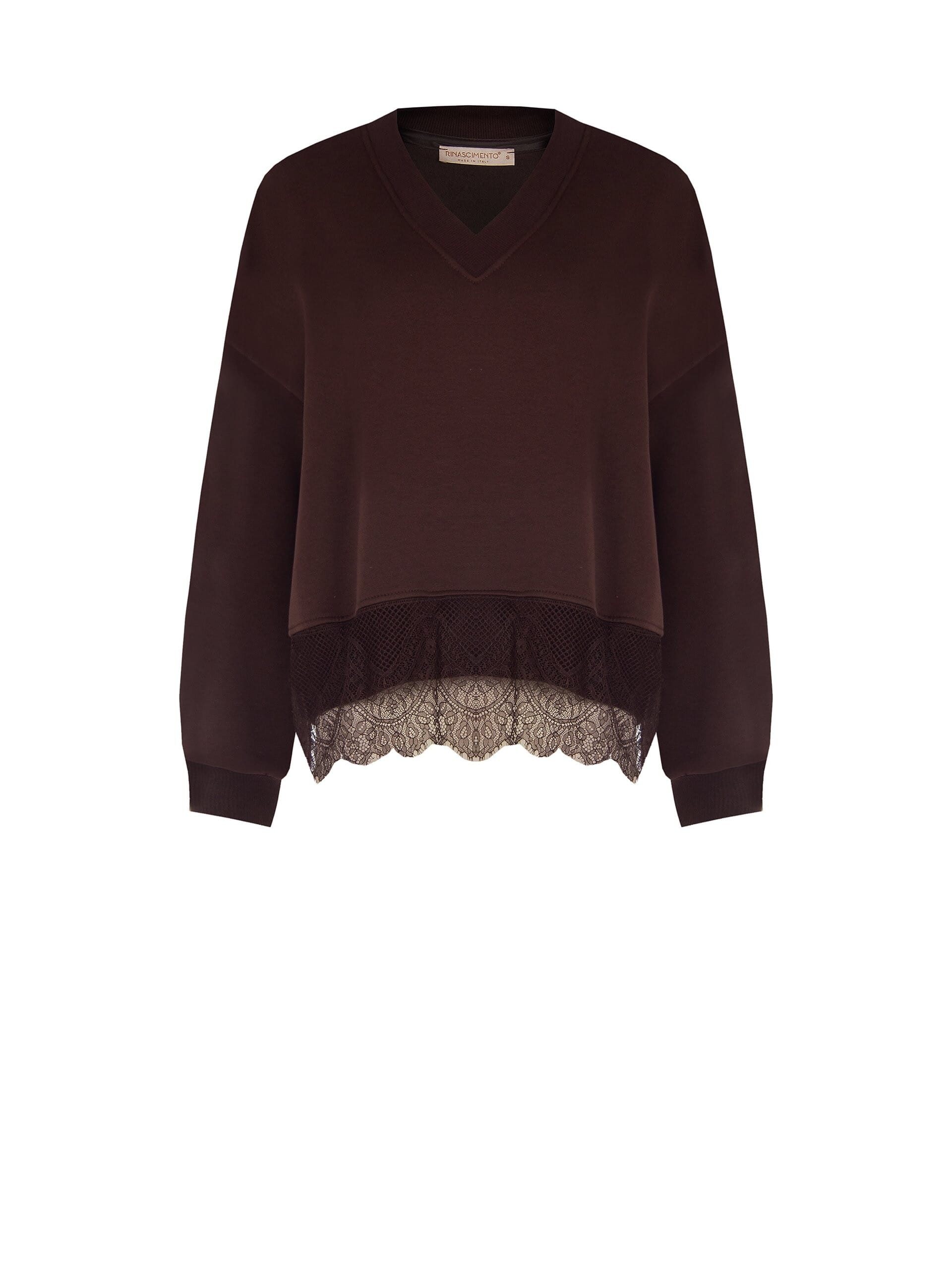 Maglia dal fit morbido e rilassato, in felpa liscia con interno soffice. Il bordo in pizzo lavorato con orlo smerlato aggiunge femminilità, mentre lo scollo a V scolpisce la linea e slancia la figura. Perfetta per l’everyday chic: da indossare in ufficio con pantaloni sartoriali o nel weekend con denim.