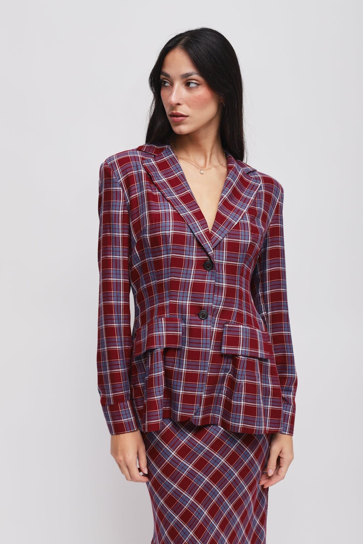Blazer Maryley a quadri, fit femminile che scolpisce la vita senza costringere. Tessuto morbido e consistente, piacevole sulla pelle. Rever a lancia e frange applicate sul retro e lungo le maniche per un movimento che cattura lo sguardo. Chiusura a due bottoni e tasche con patta. Perfetto per ufficio smart o aperitivi.