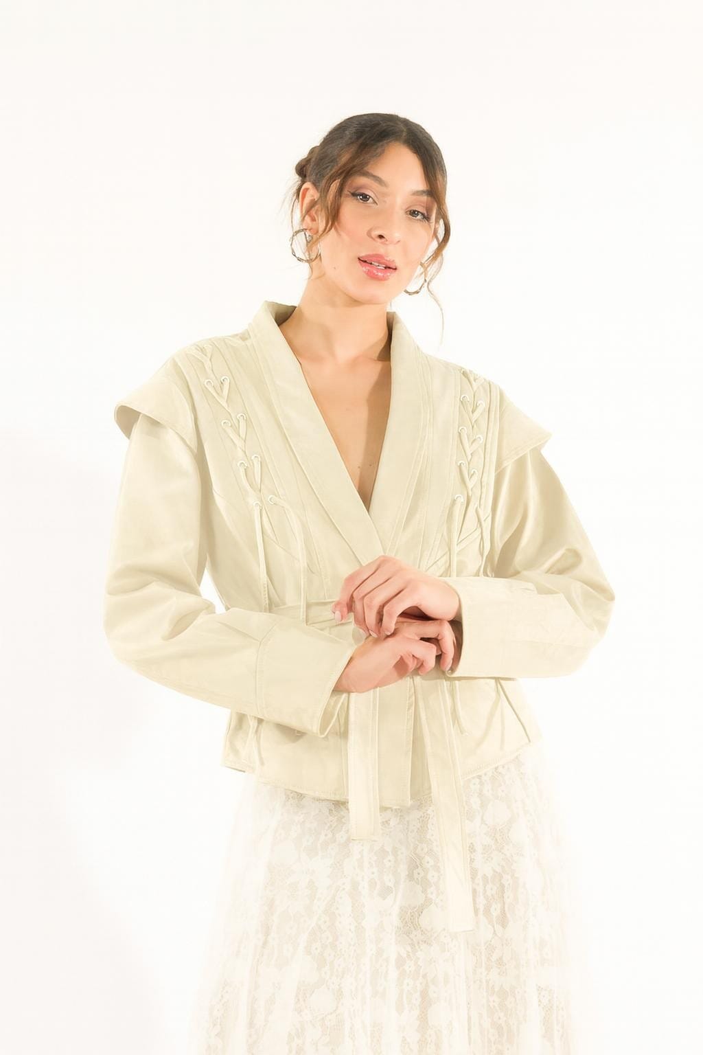 Kontatto interpreta il capospalla con taglio morbido e cintura che definisce la vita per una silhouette femminile. In morbida eco‑pelle scamosciata, avvolgente e leggera. Dettagli distintivi: scollo a rever essenziale e lacci laterali con occhielli che slanciano il busto. Perfetta per l’ufficio e gli aperitivi, si abbina con facilità.