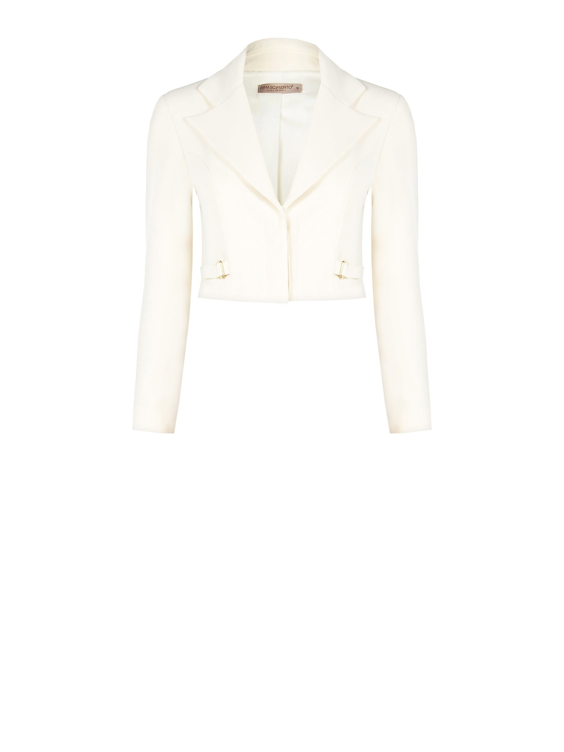 Blazer corto Rinascimento dal fit asciutto che scolpisce la vita. Realizzato in tessuto compatto e leggermente stretch per comfort e tenuta. Rever ampio e chiusura coperta slanciano il busto; micro cinturini laterali con fibbie metalliche definiscono la silhouette. Perfetto per ufficio e cerimonie, versatile anche con denim.