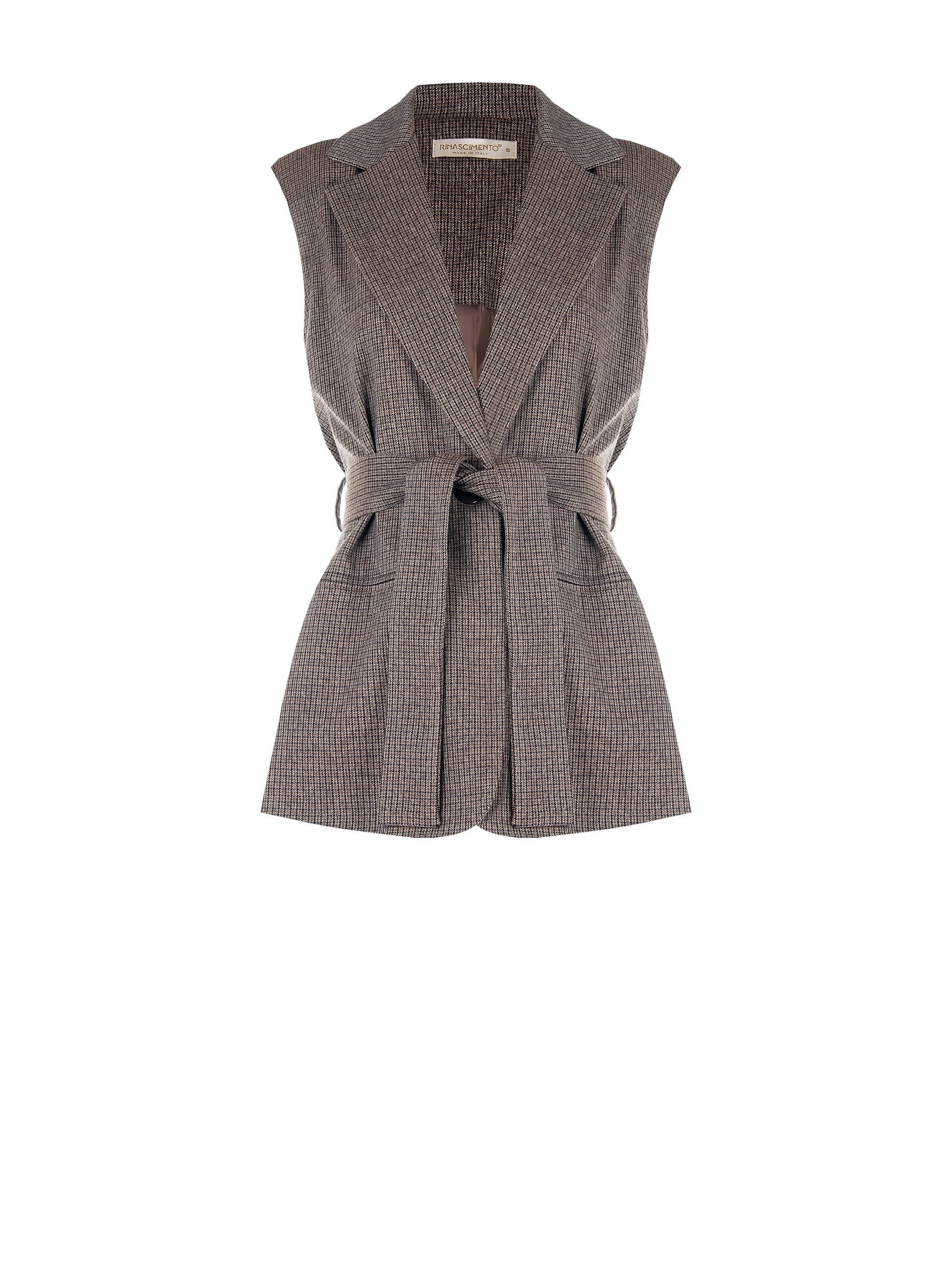 Capospalla smanicato dal fit dritto, regolabile in vita con cintura che valorizza la silhouette. Tessuto strutturato a micro-texture, rever classico e tasche applicate. Perfetto sopra camicie o dolcevita per l’ufficio e per look everyday sofisticati.