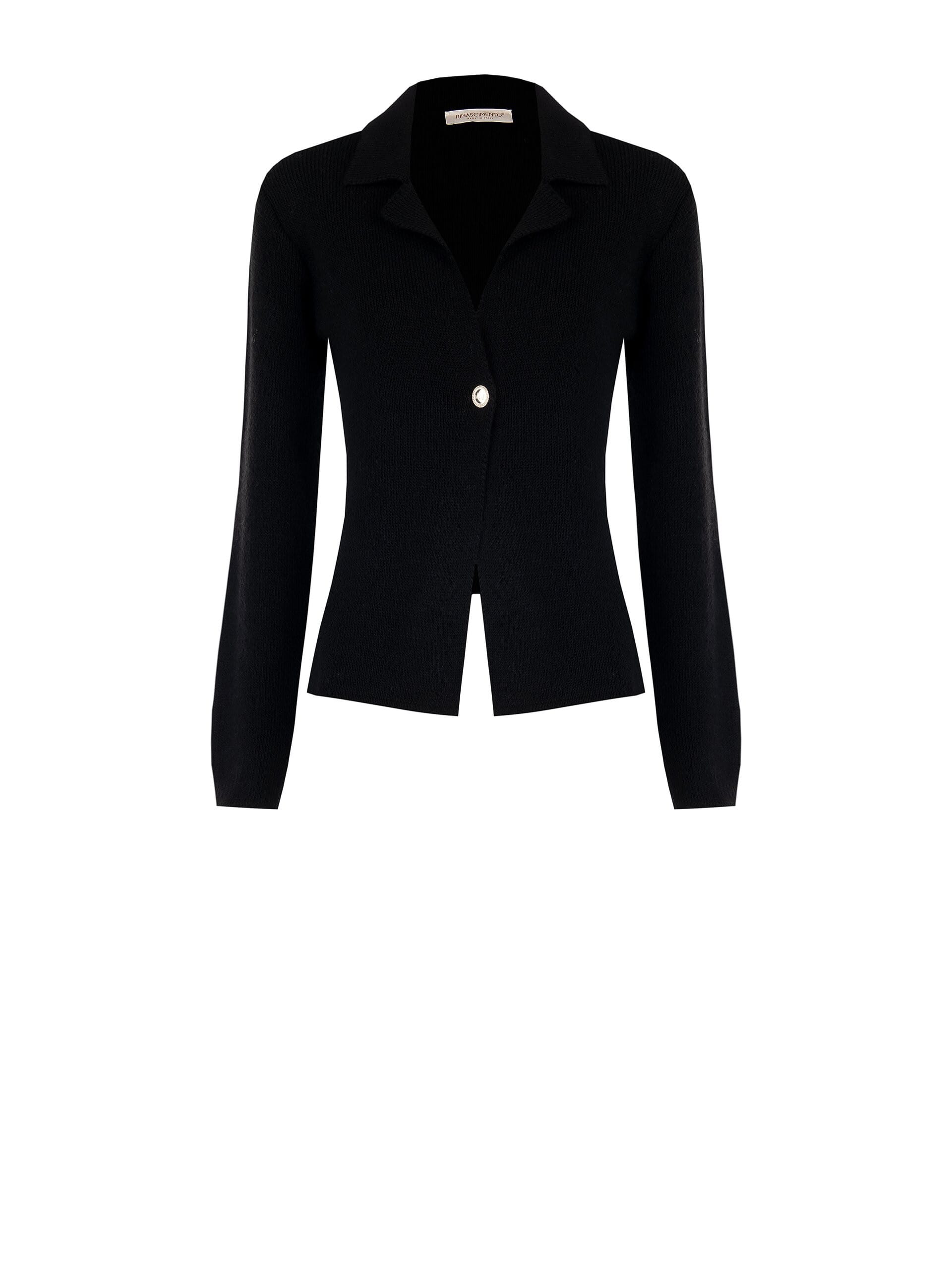 Maglia a taglio sartoriale, fit aderente che scolpisce la vita. Tricot morbido e compatto per comfort e tenuta. Colletto a rever e singolo bottone gioiello davanti, spacco posteriore che facilita i movimenti e slancia la silhouette. Versatile dal desk al dinner, perfetta su denim o pantaloni slim.