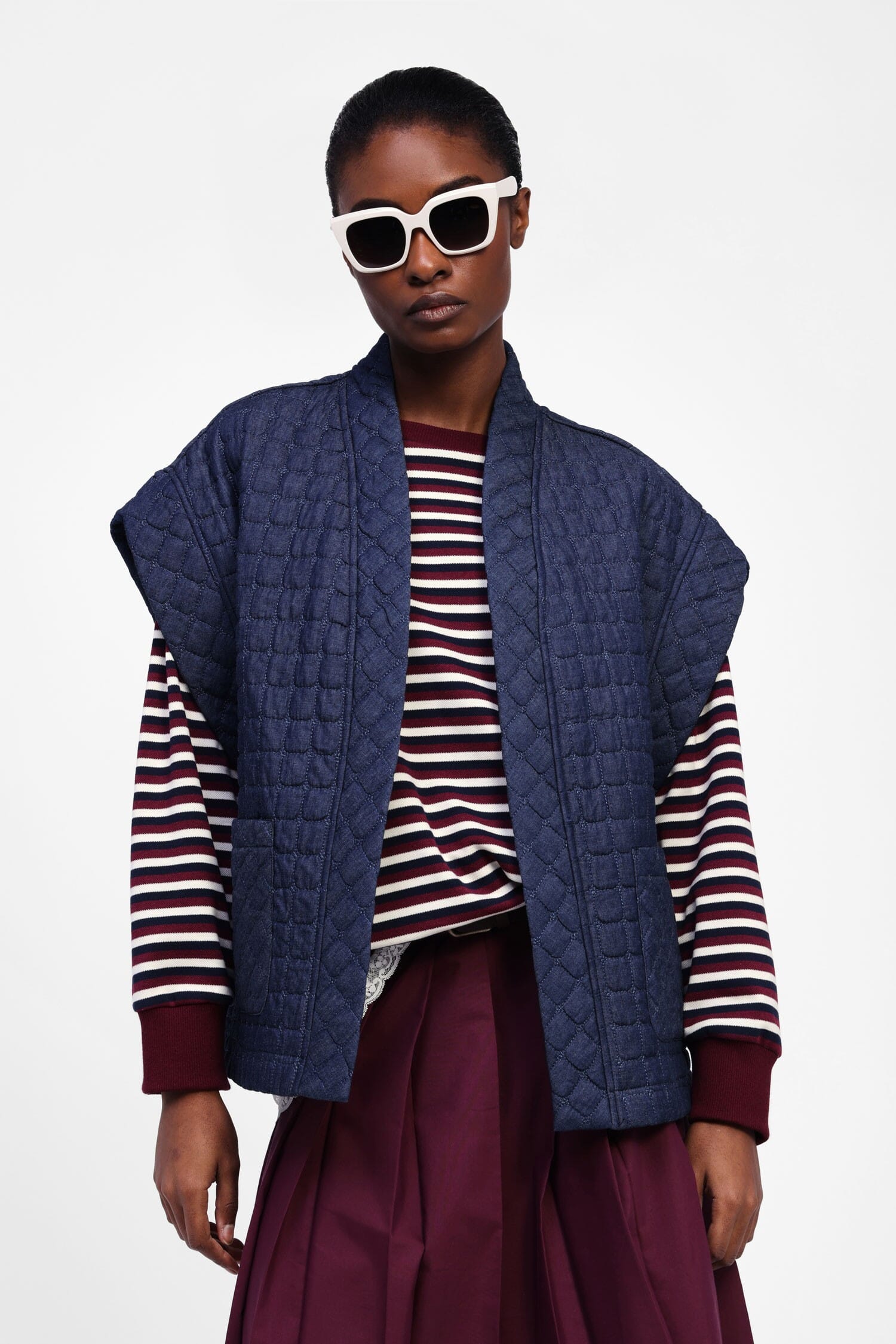 Per chi cerca l'inaspettato, questa giacca smanicata trapuntata è un invito a esplorare il tuo stile. La sua struttura senza chiusura evoca un fascino senza sforzo, perfetta per sovrapporre strati in modo creativo. Un must-have per chi ama i dettagli ricercati e desidera un capo che parli da sé, aggiungendo un tocco di originalità al tuo guardaroba.
