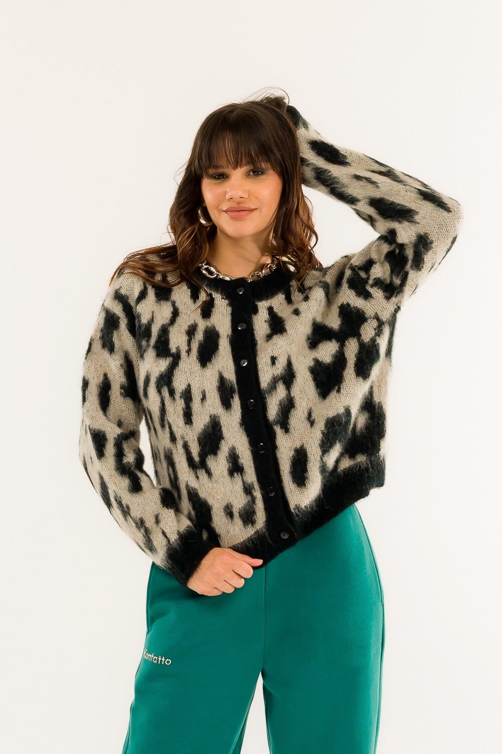 Cardigan corto dal fit morbido che valorizza la silhouette senza costringerla. Maglia soffice e calda effetto peluche con lavorazione jacquard animalier; profilo a costine e bottoni frontali. Perfetto su denim o tailoring per l’ufficio, ideale anche per i tuoi look everyday con un tocco audace. Brand: Kontatto.