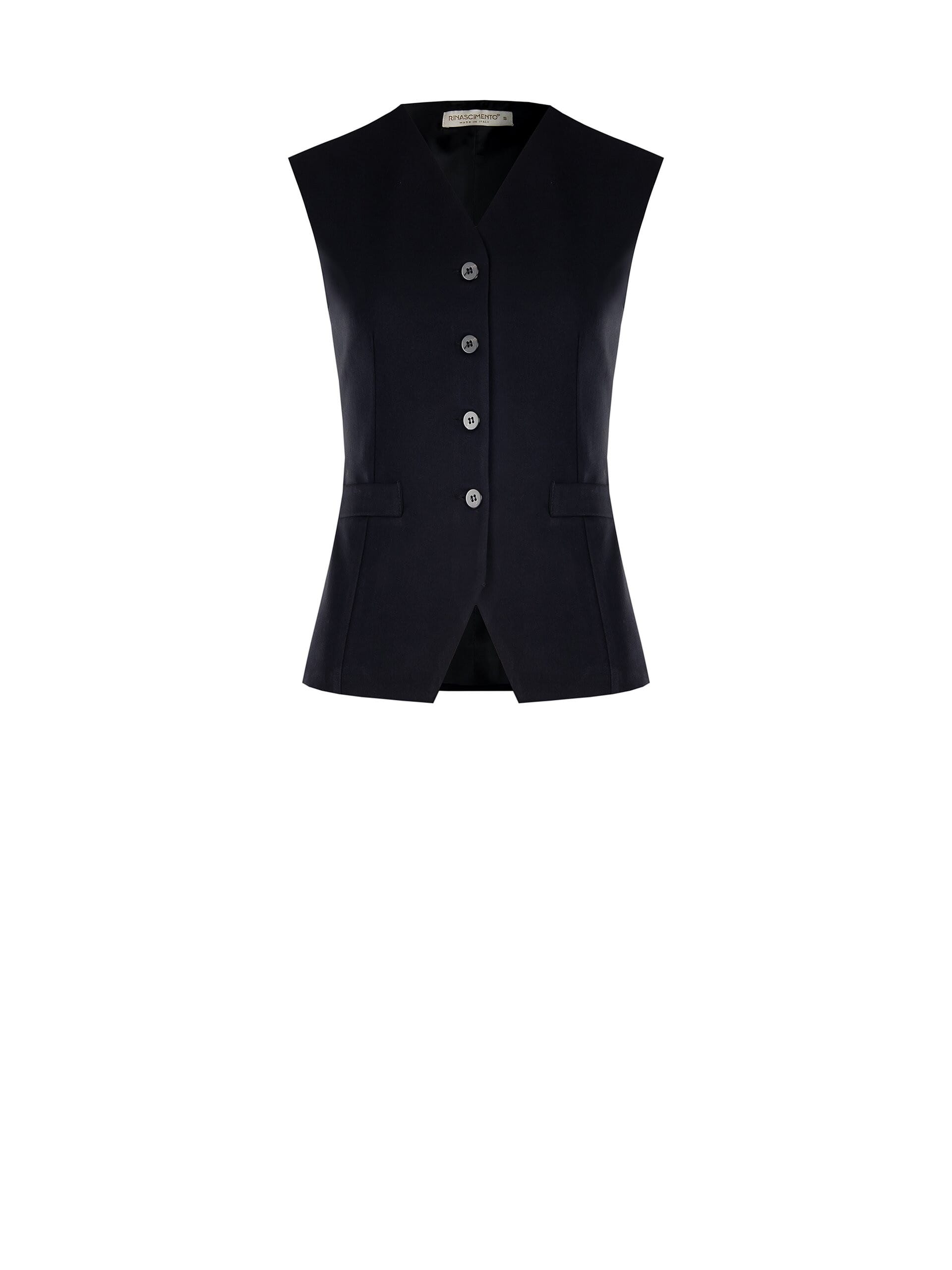 Gilet lungo Rinascimento, taglio dritto con vita regolabile grazie ai lacci posteriori per una silhouette definita. Realizzato in morbido misto viscosa dalla mano liscia, confortevole tutto il giorno. Scollo a V e bottoni frontali, taschini a filetto. Perfetto su camicie o abiti per ufficio e aperitivi.