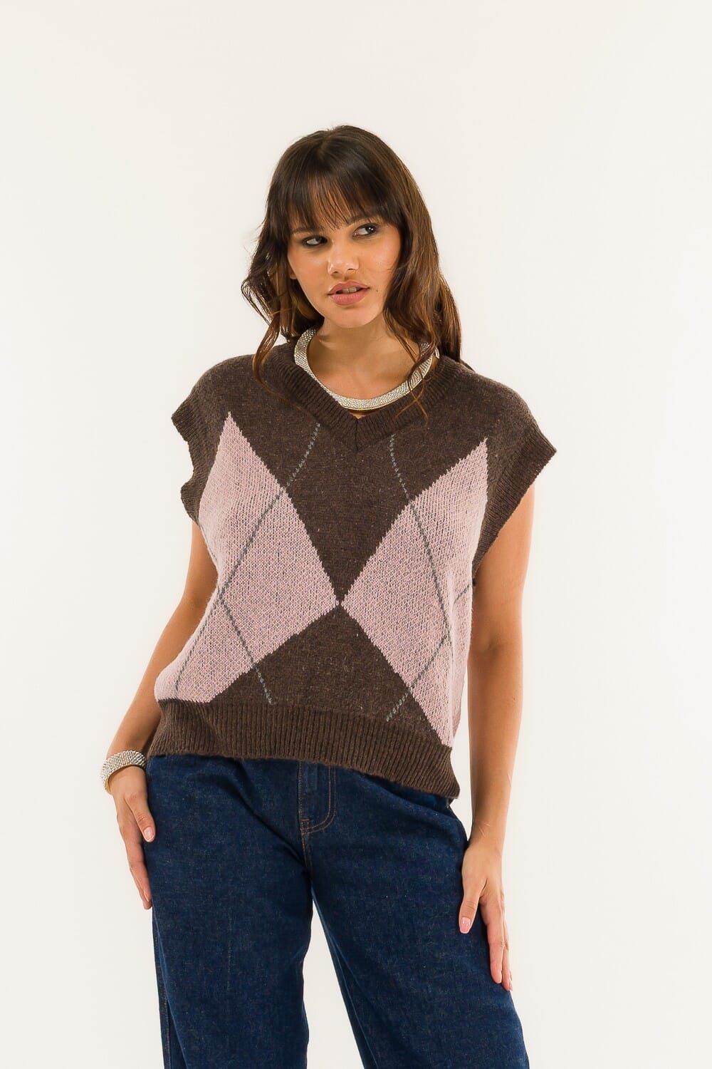 Maglia senza maniche dal fit morbido e dritto, che valorizza la silhouette senza costringerla. Tricot soffice in blend di lana con motivo jacquard a rombi, scollo a V e bordi a costine per una vestibilità stabile. Perfetta su camicia per l’ufficio o da sola nel daily casual chic. Brand: Kontatto.