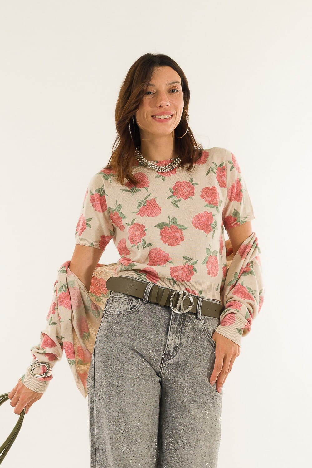 Maglia Kontatto a maniche corte, fit regular che accarezza la silhouette. Filato leggero e morbido, con texture jacquard a motivo floreale. Collo rotondo pulito, bordi a costine che definiscono il punto vita. Perfetta per l’ufficio con blazer o per l’everyday con denim e gonne.