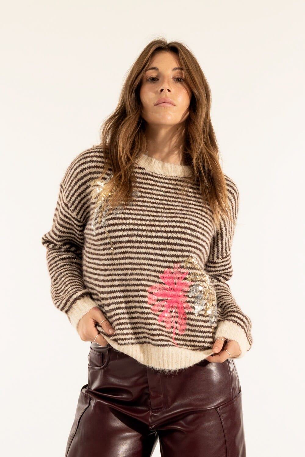 Maglia dal fit morbido e rilassato, in filato soffice con mano calda e rigata. Ricami di paillettes a motivo botanico illuminano il davanti, mentre collo tondo e bordi a coste definiscono la silhouette. Versatile da giorno: perfetta con denim o pelle per l’ufficio informale e l’everyday con un tocco brillante.