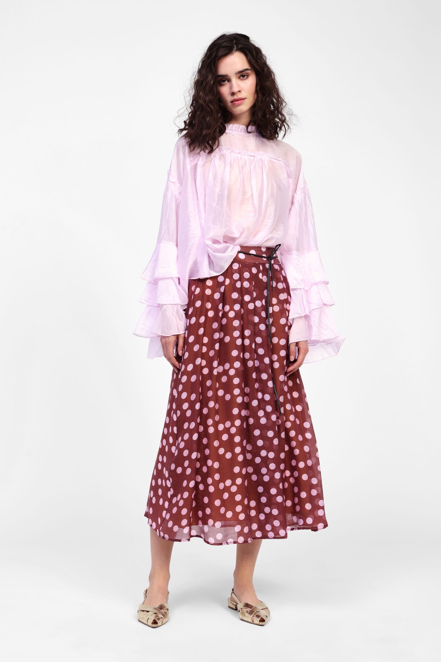 Un'elegante gonna a pois, perfetta per aggiungere un tocco di vivacità al tuo guardaroba. La sua lunghezza media si adatta a diverse occasioni, mentre la vita elastica e il cinturino regolabile offrono praticità quotidiana. Il design morbido e fluente garantisce comfort e stile in ogni movimento.