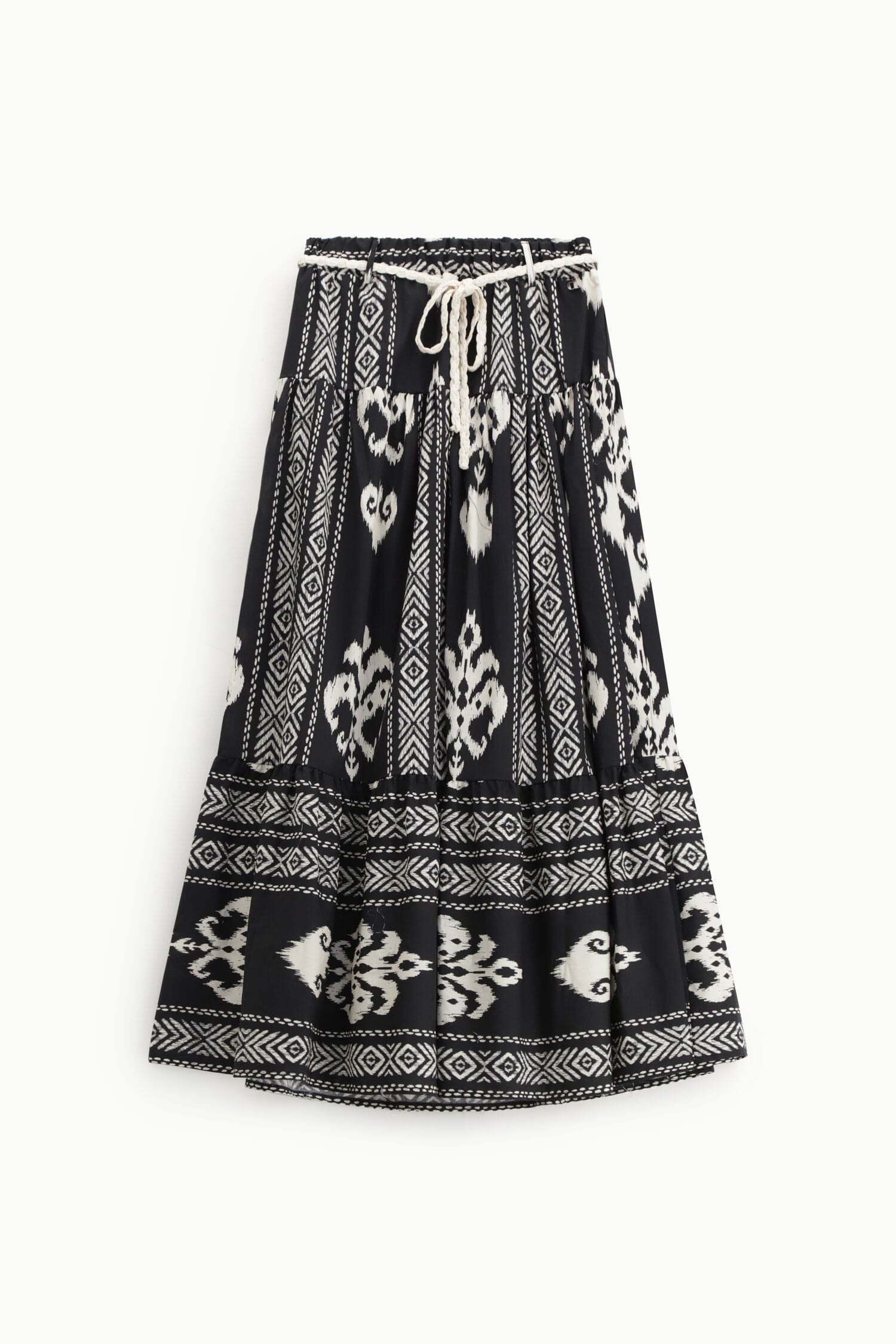 Una gonna che unisce comodità e stile grazie al cordoncino regolabile in vita e alla sua lunghezza versatile. Il motivo geometrico aggiunge un tocco di originalità, perfetto per essere indossata in ogni occasione, dalla giornata lavorativa alle serate più rilassate. Un capo che invita a giocare con abbinamenti e accessori personali.