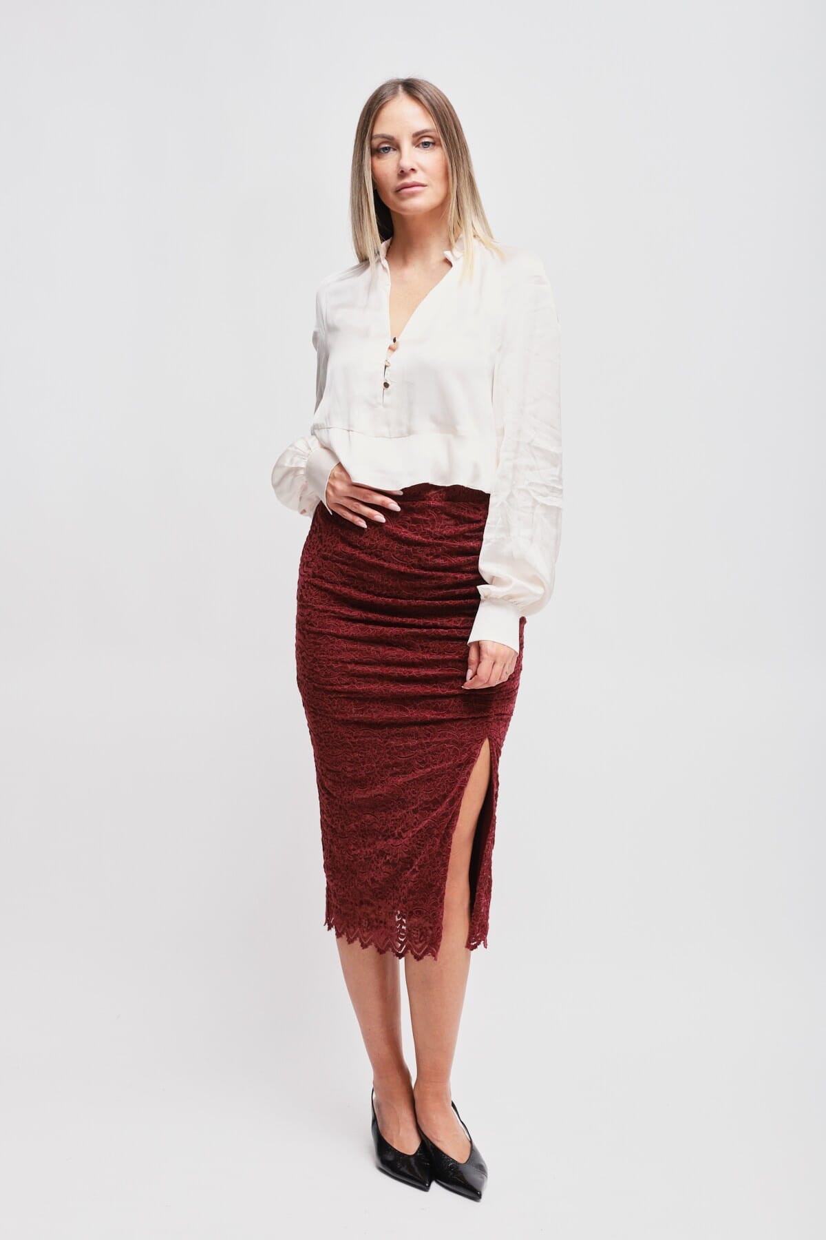 Maryley firma una gonna midi dal fit fasciante che scolpisce la silhouette con comfort. Pizzo floreale morbido e leggermente stretch, arricciature frontali che esaltano il punto vita e spacco laterale per movimento. Orlo smerlato. Perfetta da ufficio a cocktail, con blazer o top setoso.